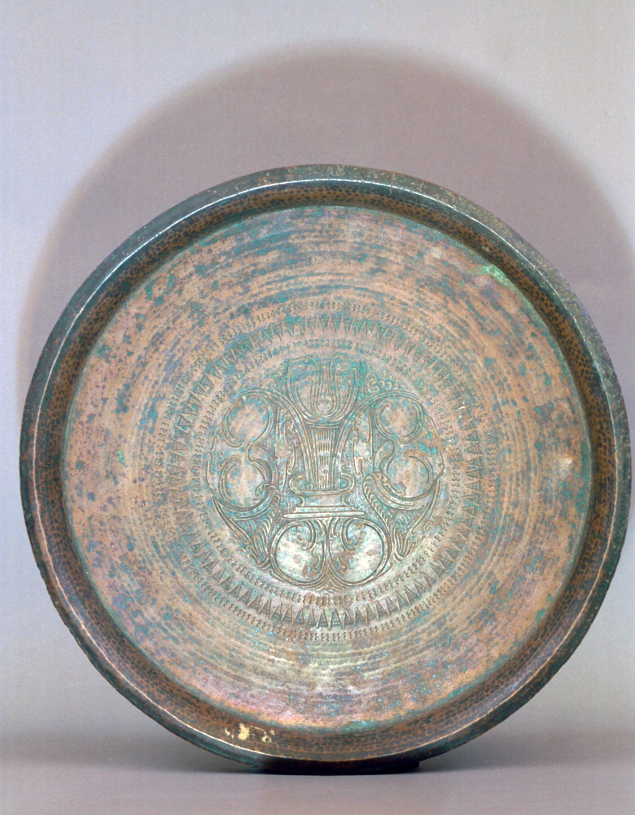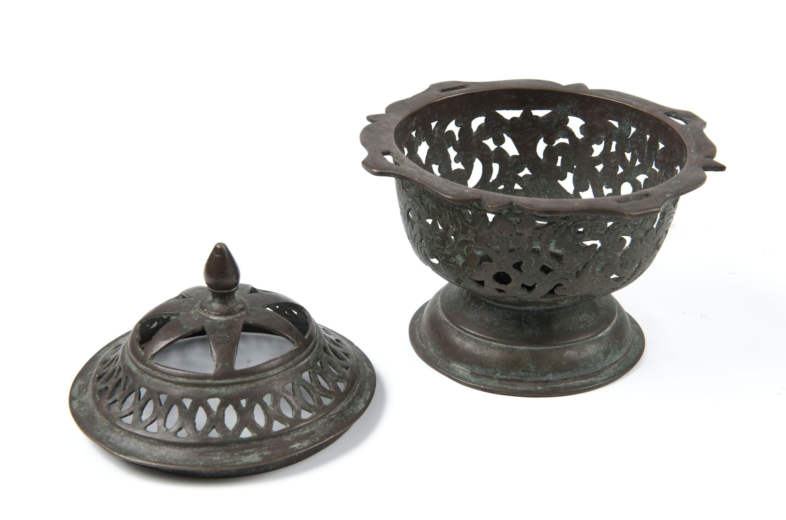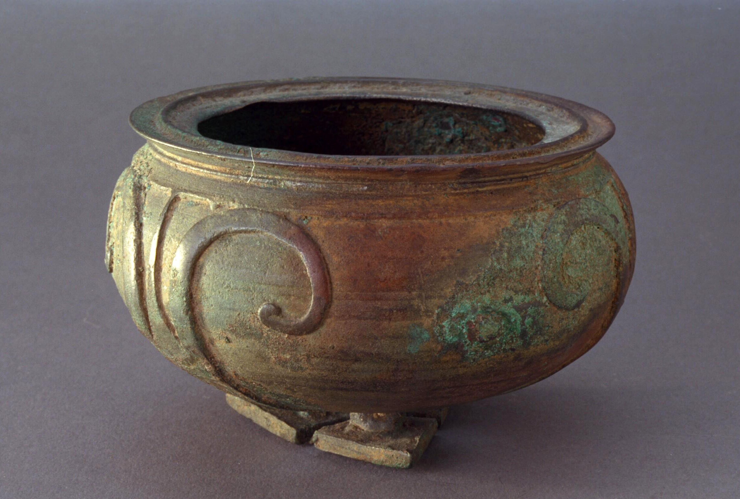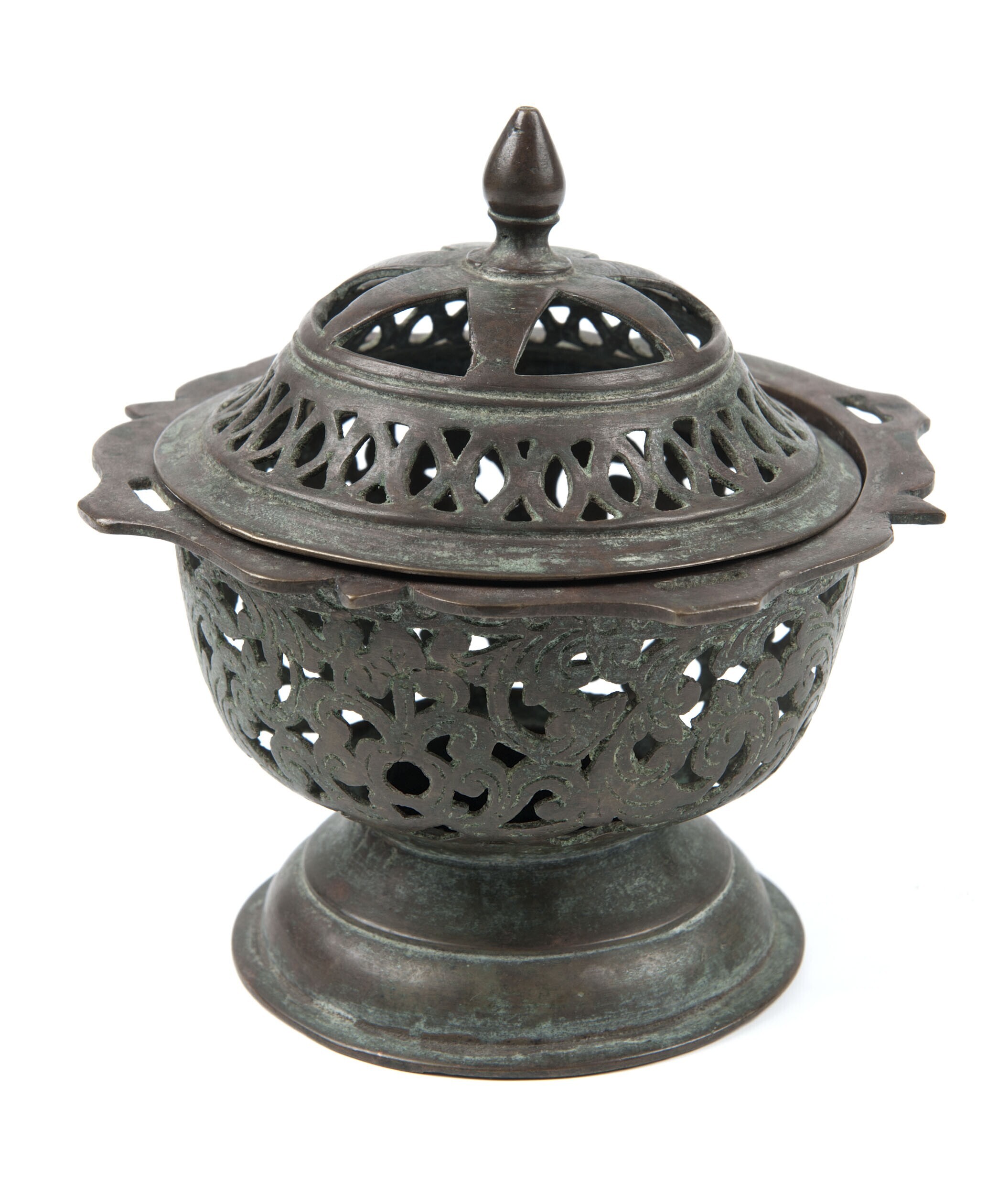 Opengewerkte metalen bak op voet, vermoedelijk wiero...