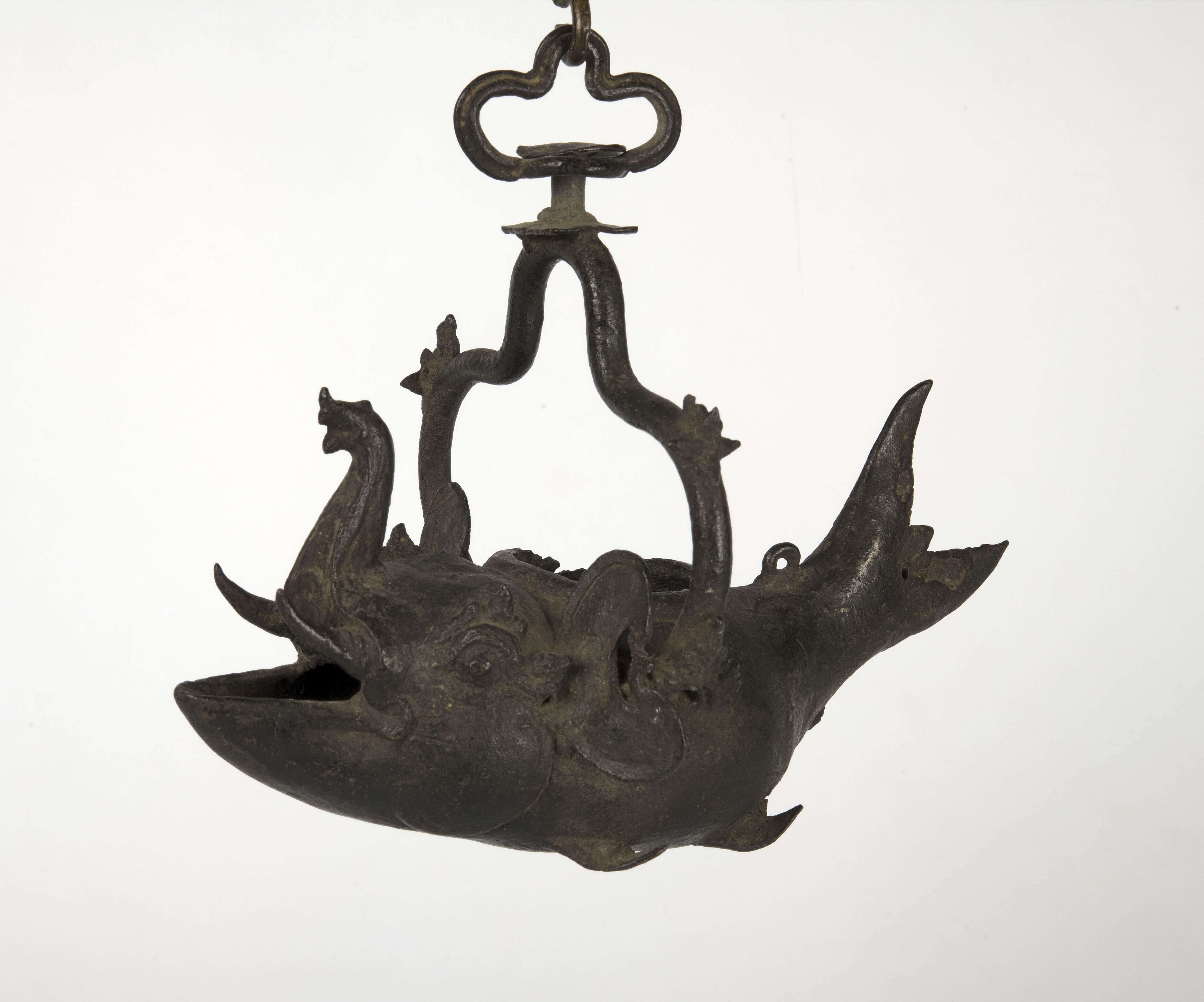 Bronzen hanglamp in de vorm van een makara, een myth...