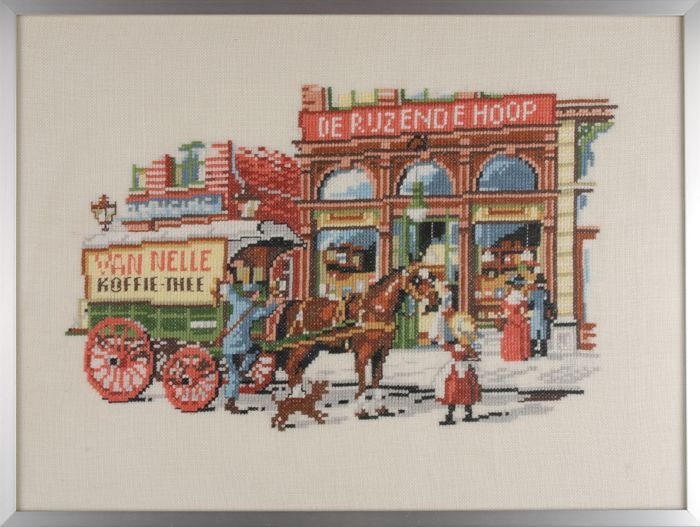 Geborduurde afbeelding van oude Van Nelle winkel "de...
