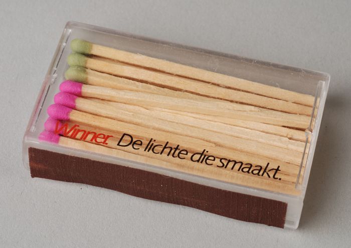 Plastic lucifersdoosje met "Winner, de lichte die sm...