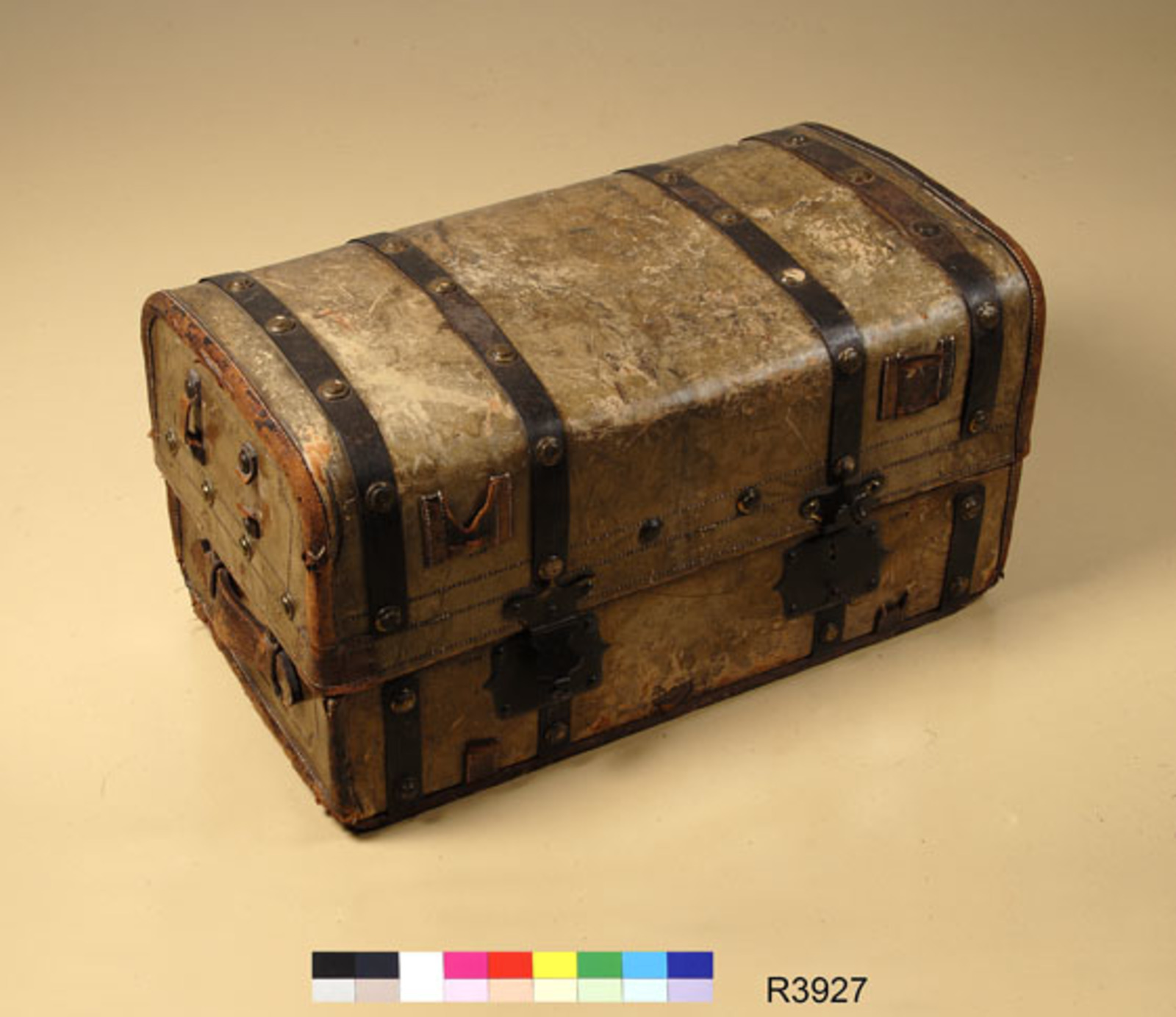 Leren hutkoffer met riemen en ijzeren banden, losse ...