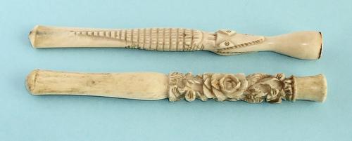 Sigarettenhouders. Twee ivoren sigarettenpijpjes, c...
