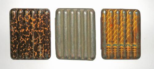 Tabaksdozen, messing en metaal. Vijf langwerpige do...