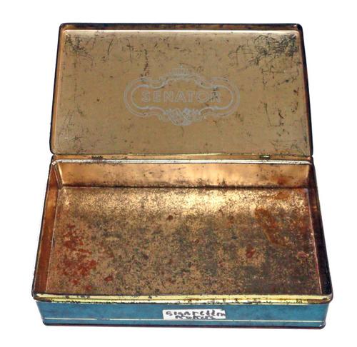 Sigarenblik. Langwerpig plat metalen sigarenblik, s...