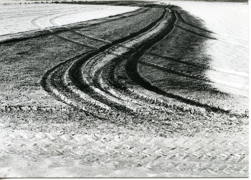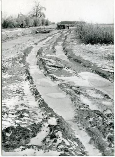 Foto in zwart-wit van een landweg met bandensporen e...