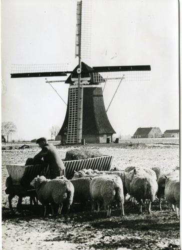 Foto in zwart-wit van schapen bij een molen door J.D...