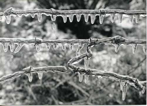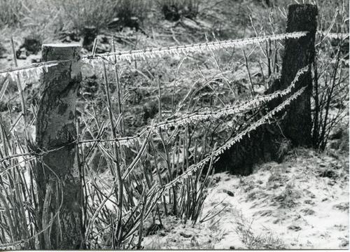 Foto in zwart-wit van prikkeldraad met ijzel door Jo...
