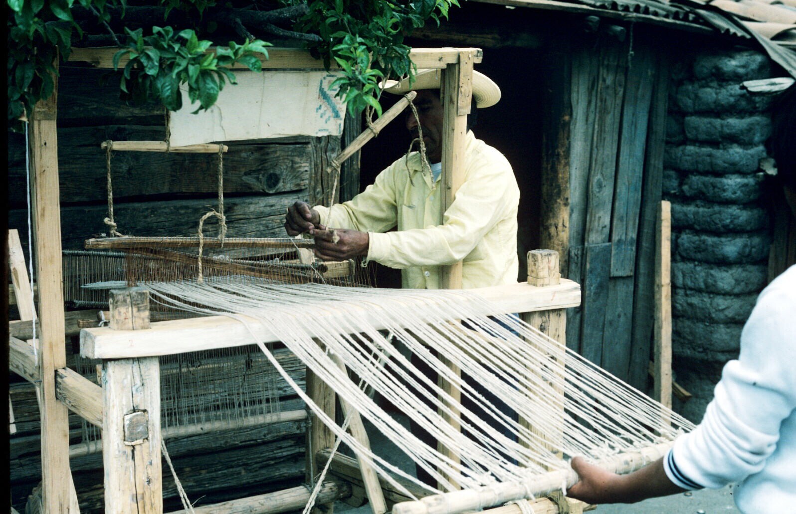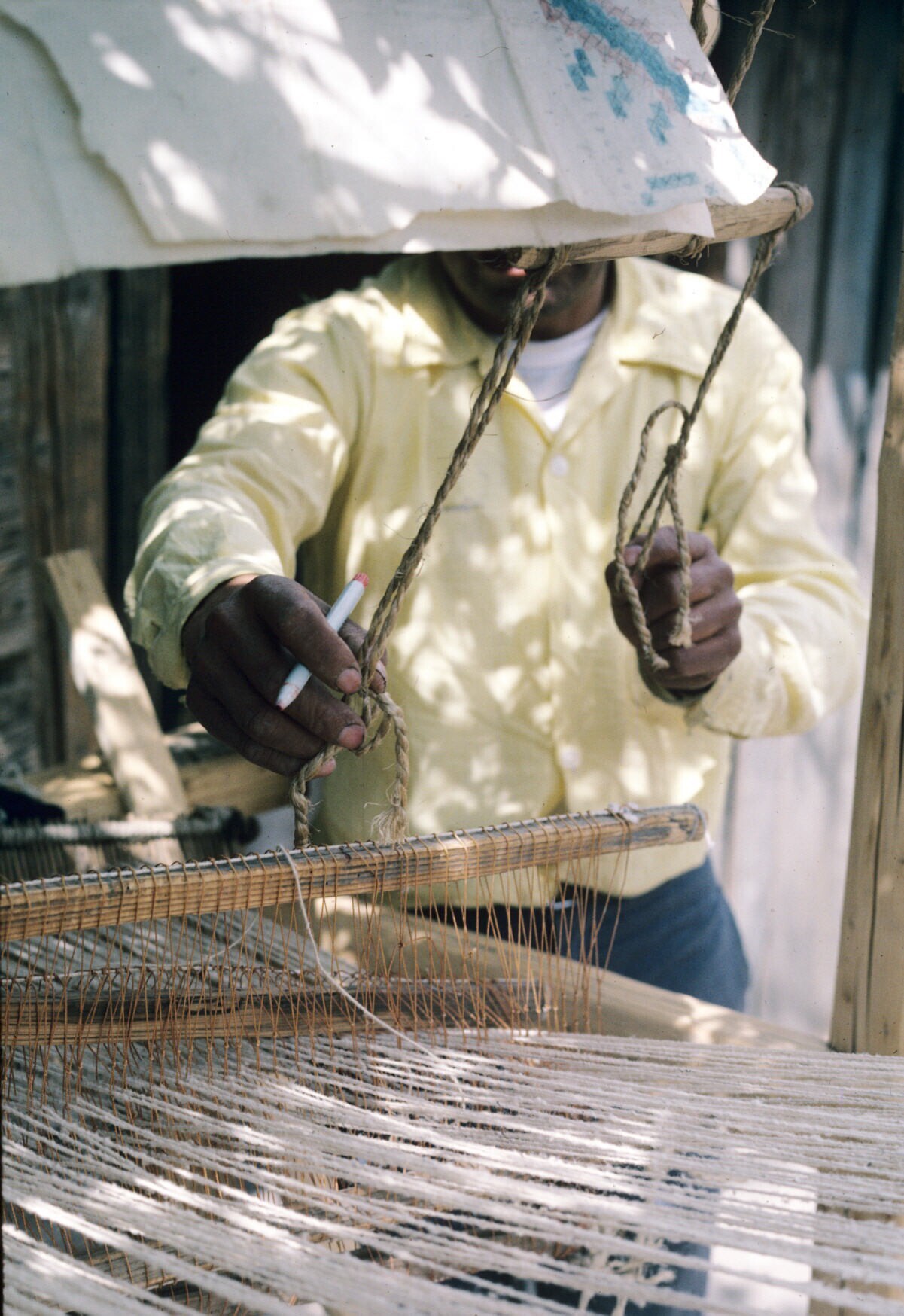 wever Filiberto Lazcaro, weefgetouw klaarmakend voor...