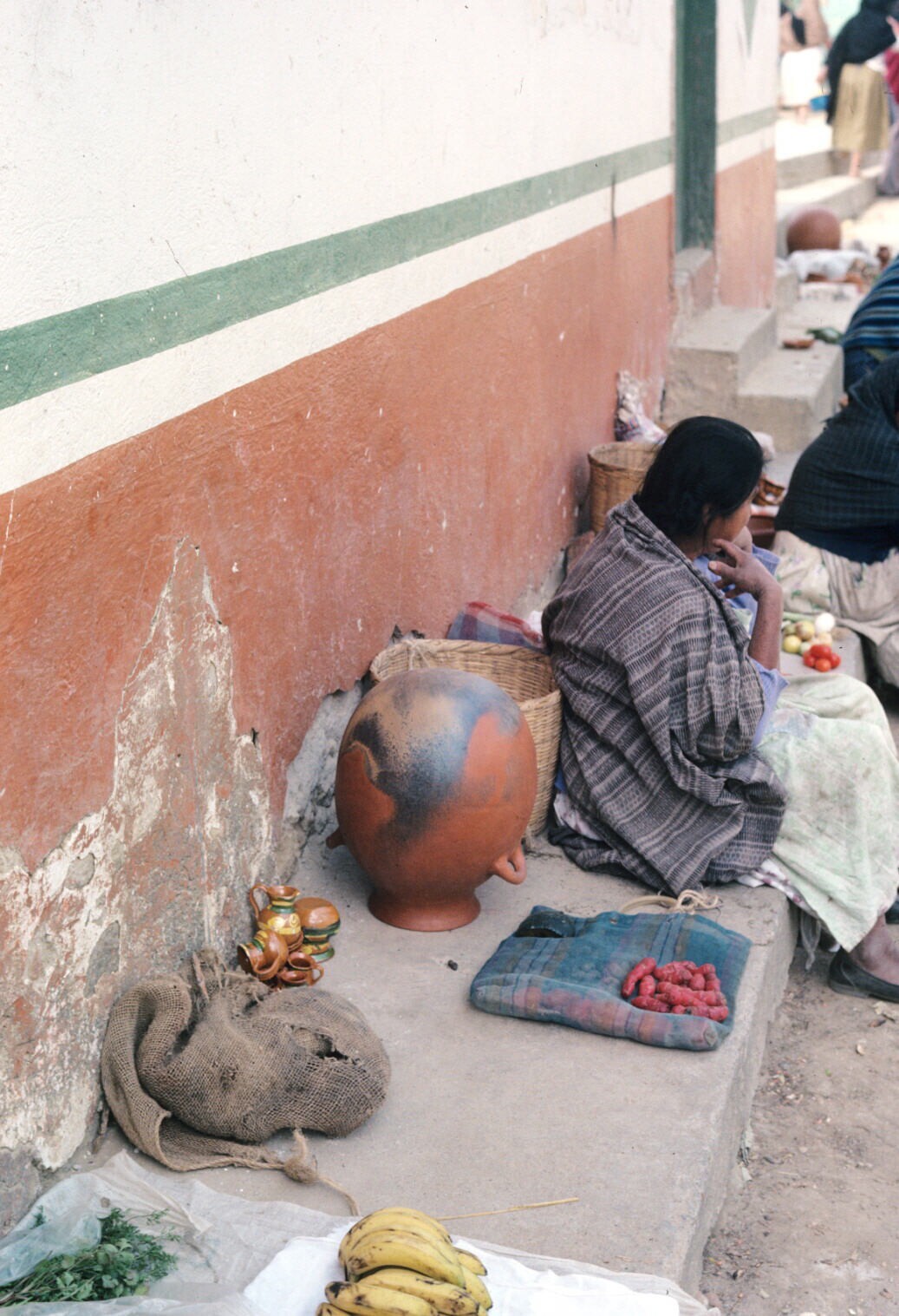 'ixtle'(agave)vezeltassen en pulqueverkoopster op markt
