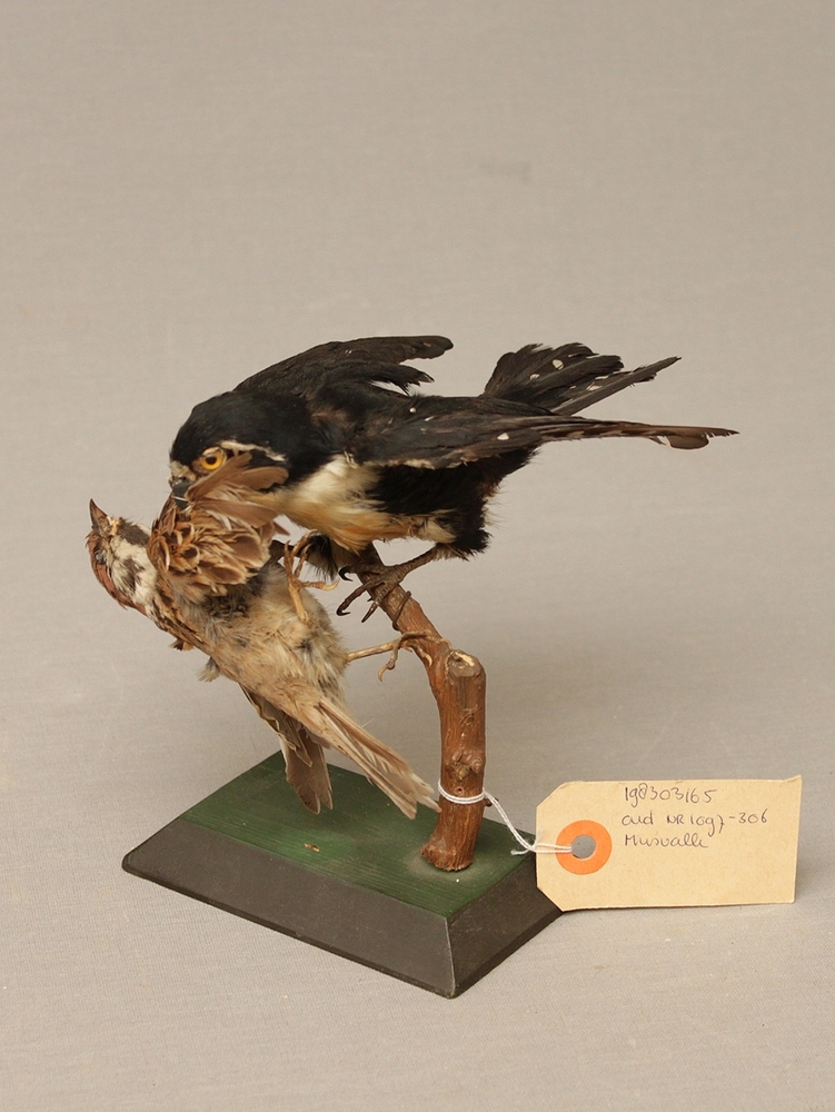Musvalk; met prooi (mus); NB. niet realistisch want ...