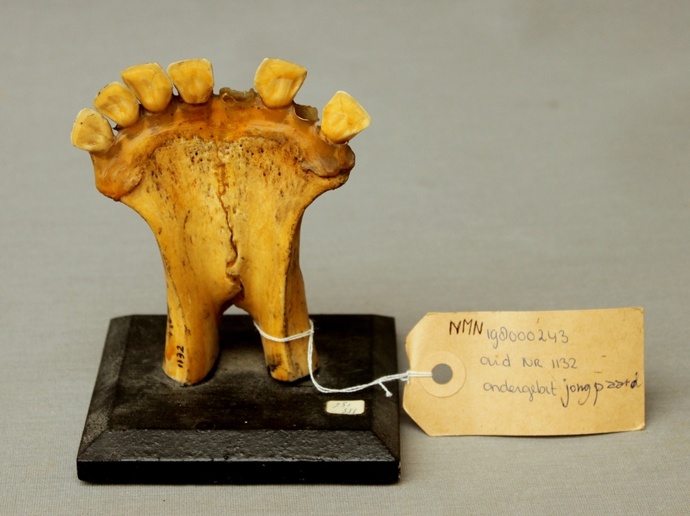 Paard; voorste deel onderkaak; op plank gemonteerd