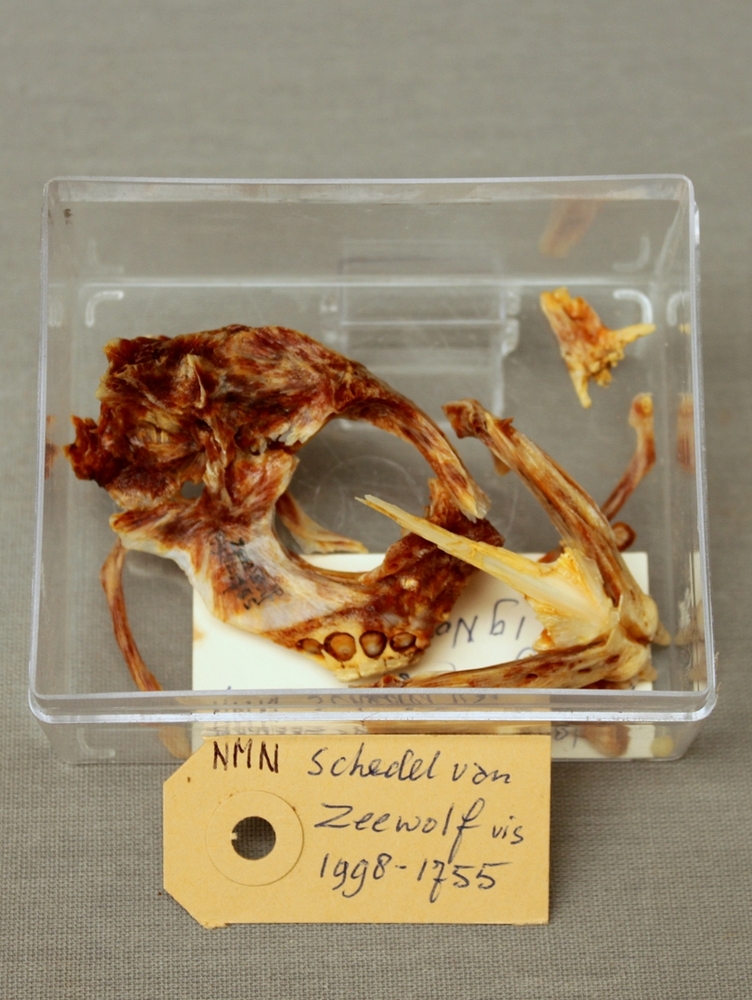 Zeewolf; delen van schedel; in doosje