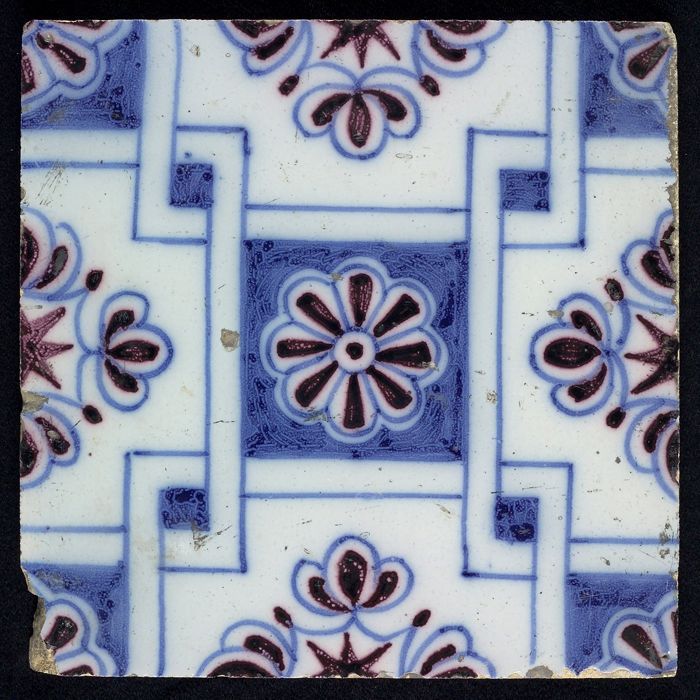Ornamenttegel, paars op wit, kruisroos, hoekmotief o...