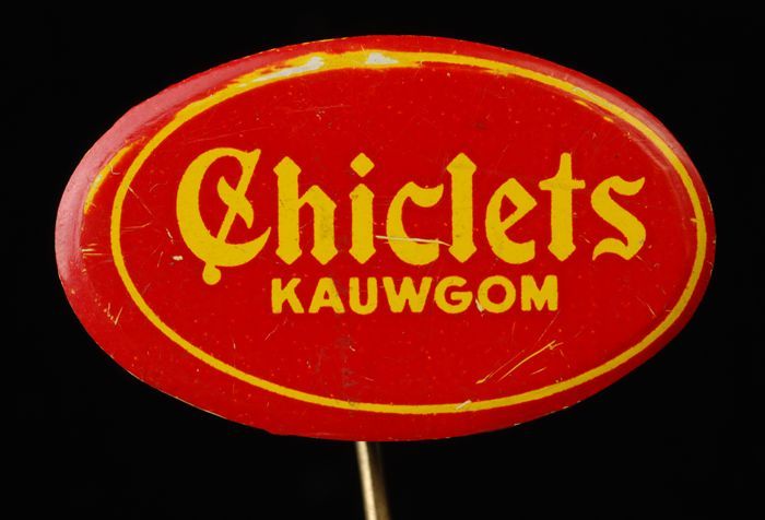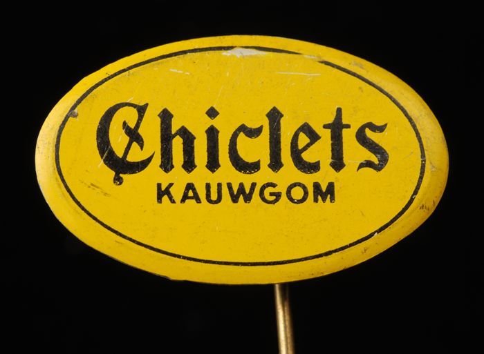 Ovale speld, geel met "Chiclets kauwgom"