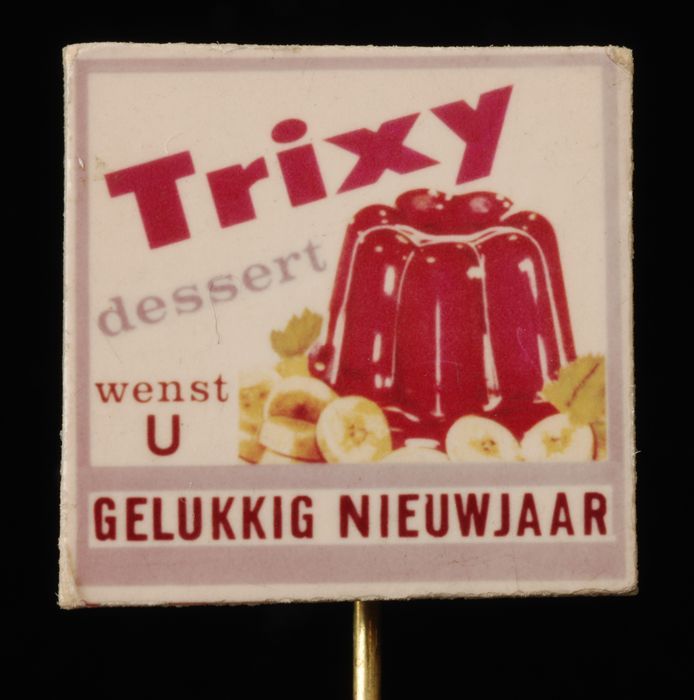 Speld met rode pudding en "Trixy dessert wenst U Gel...