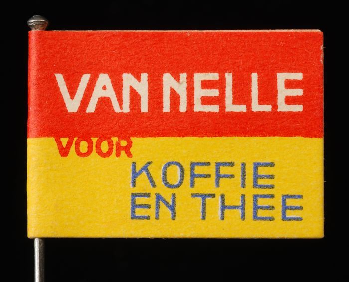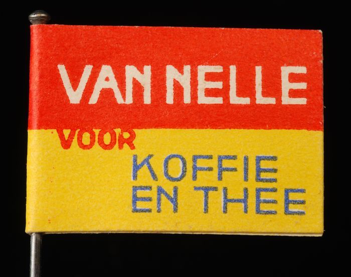 Speld met papieren vlag "Van Nelle voor Koffie en Thee"