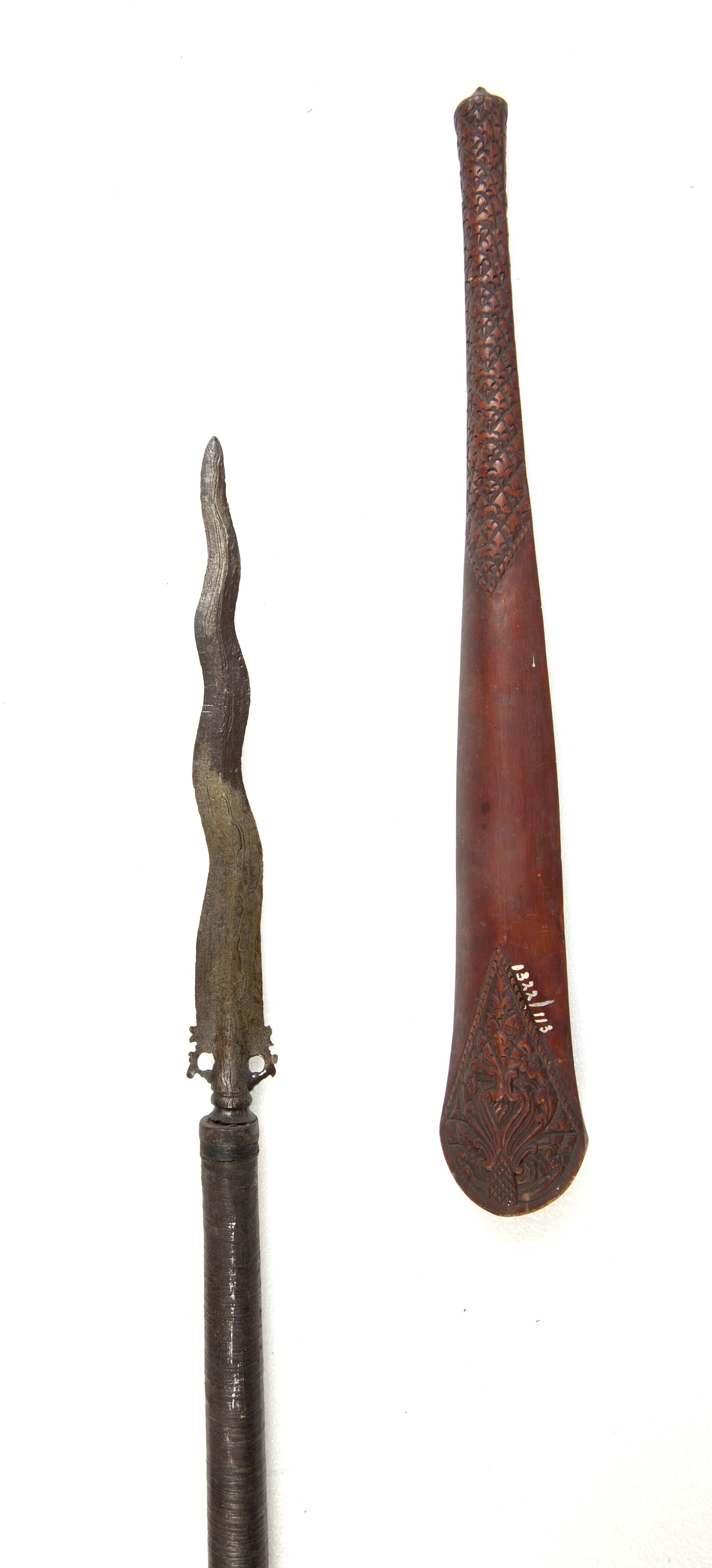 Metalen kris met schede met houtsnijwerk