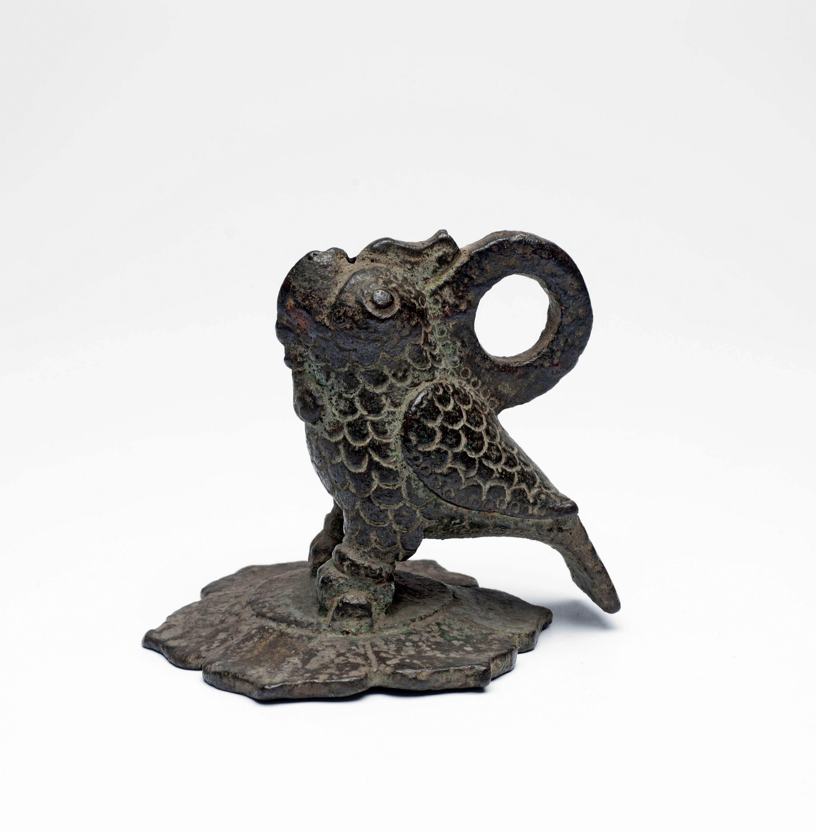 Bronzen vogelkop met een lange nek