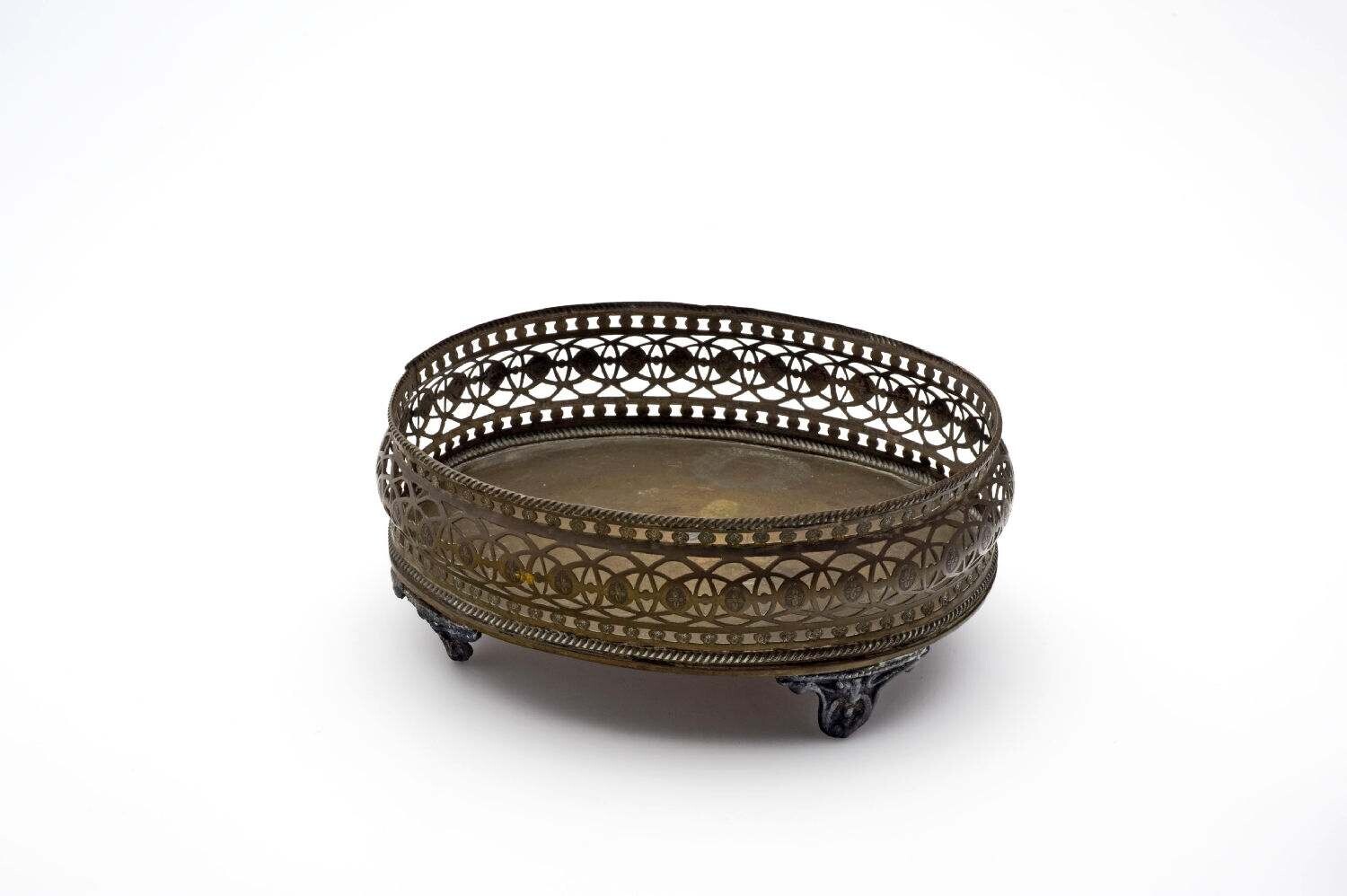 Messingen schaal op pootjes behorend bij een sirihstel