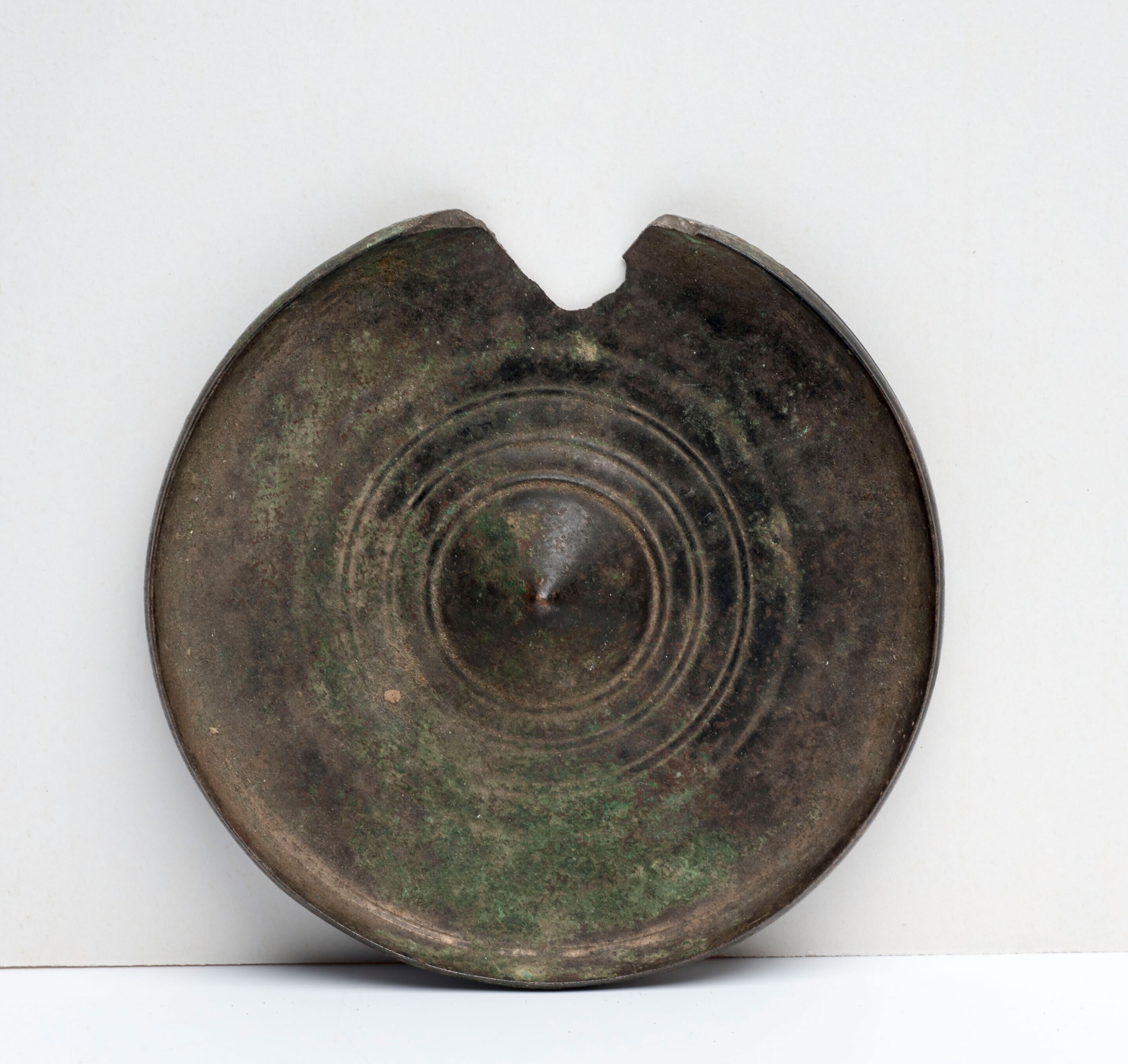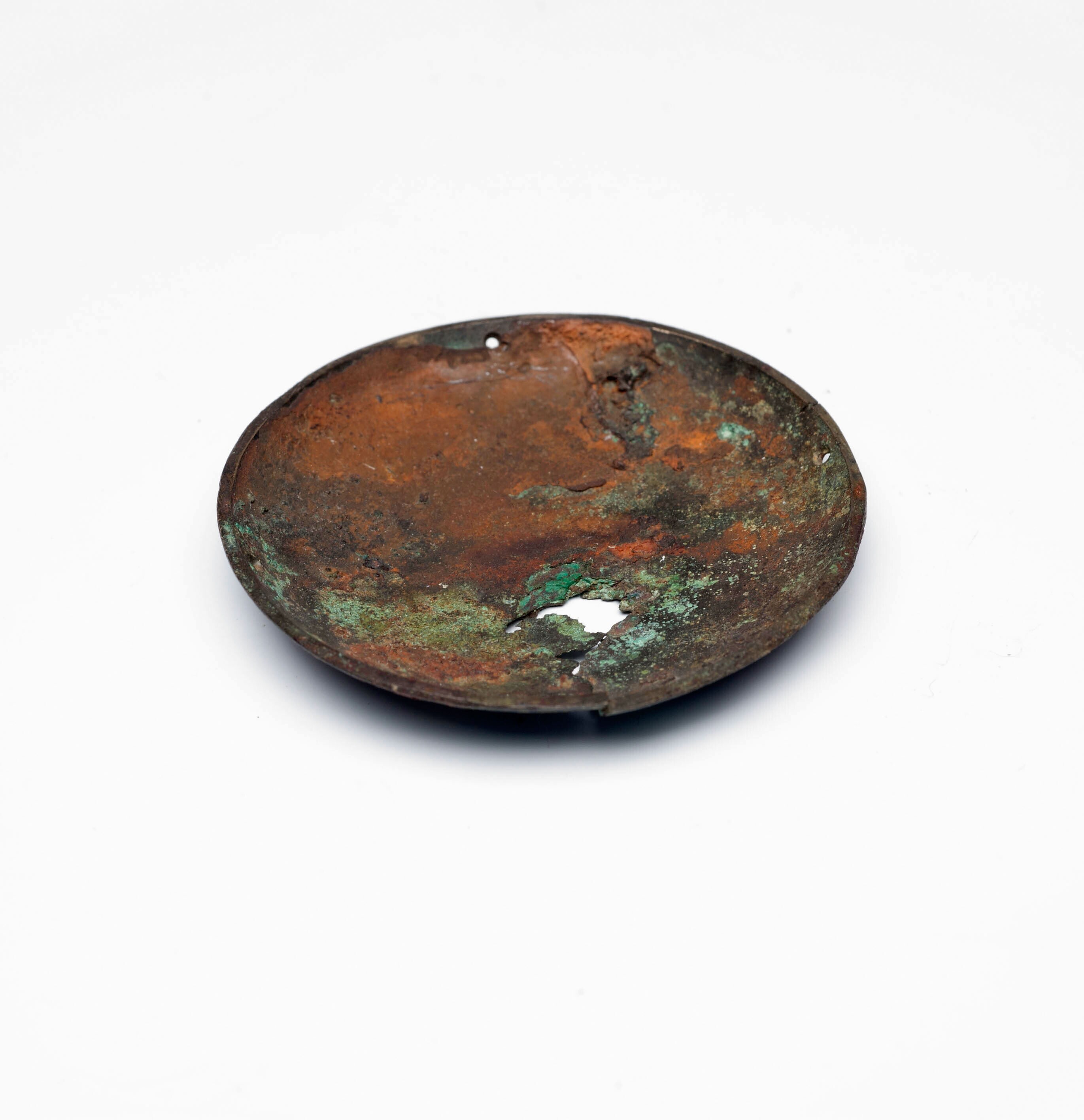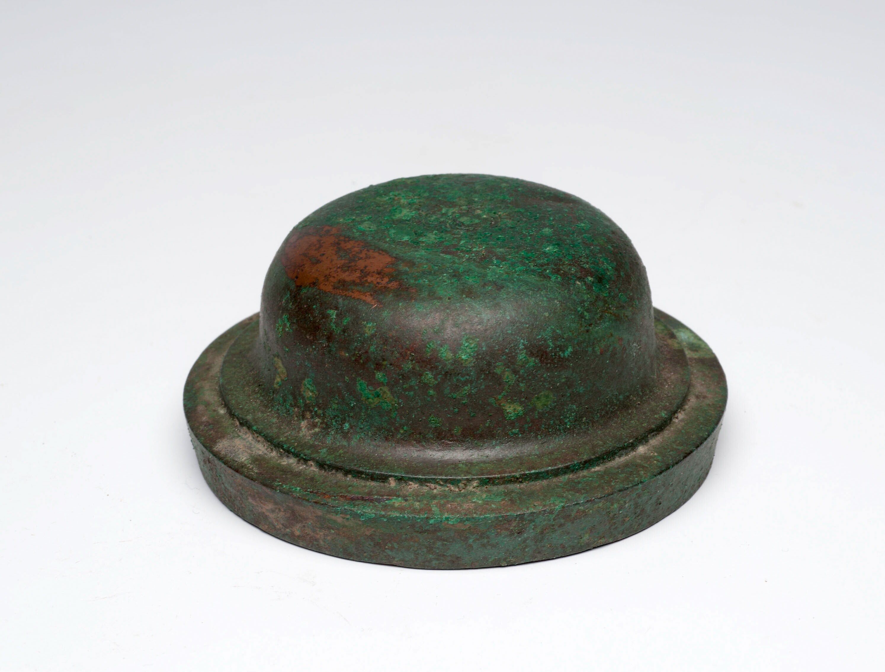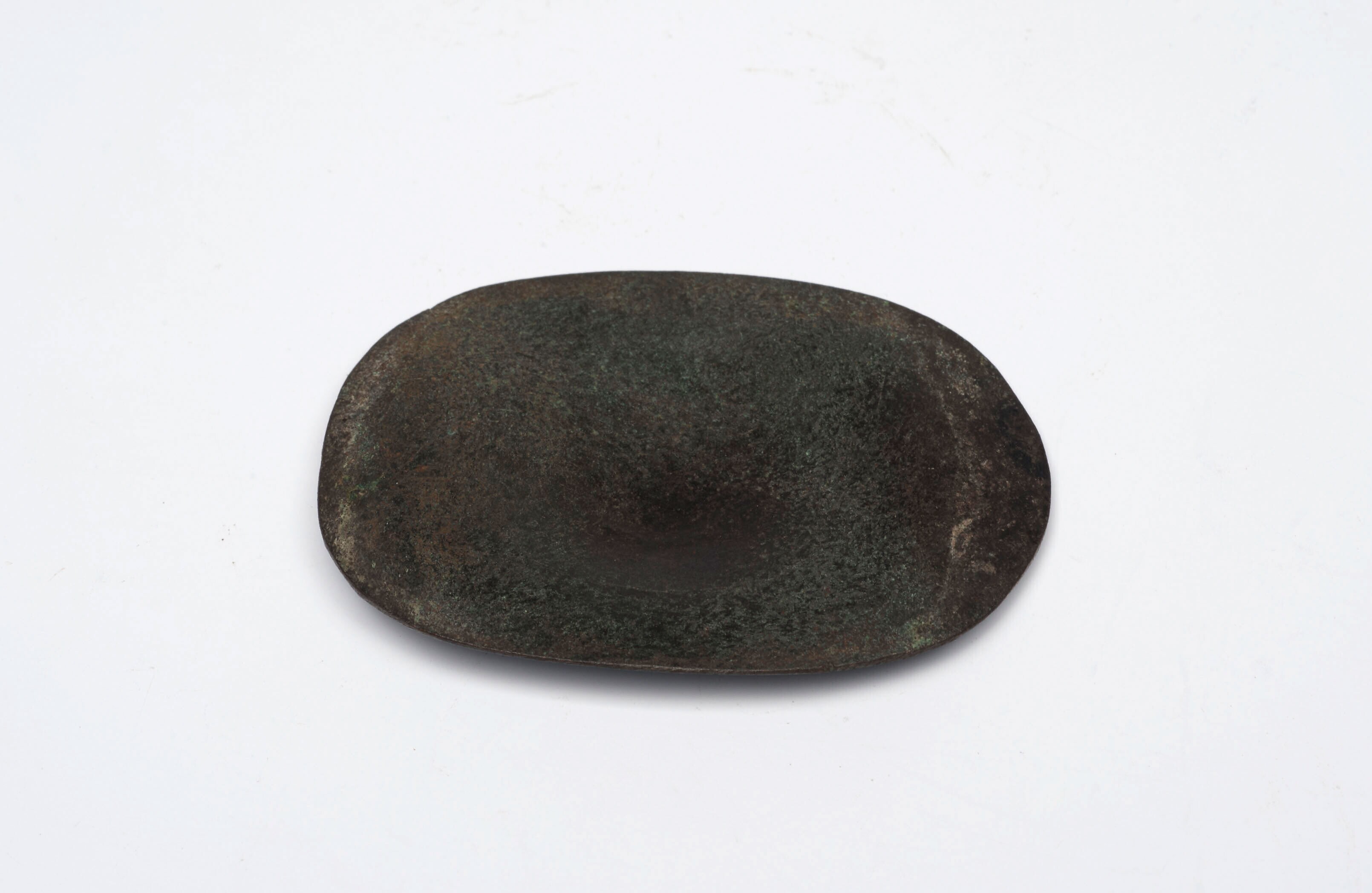 Ovaal bronzen plaatje met een ronde deuk in het midden