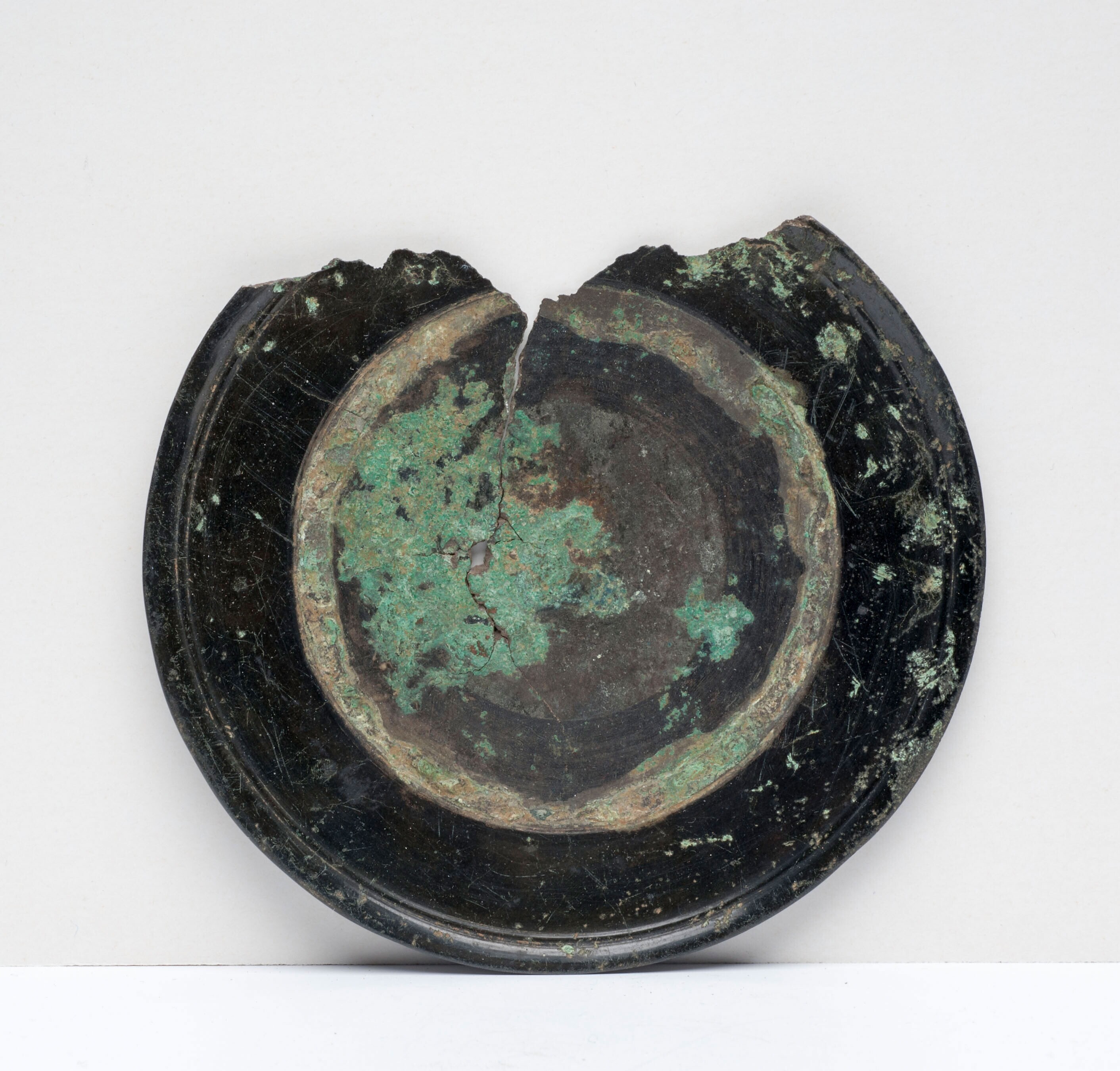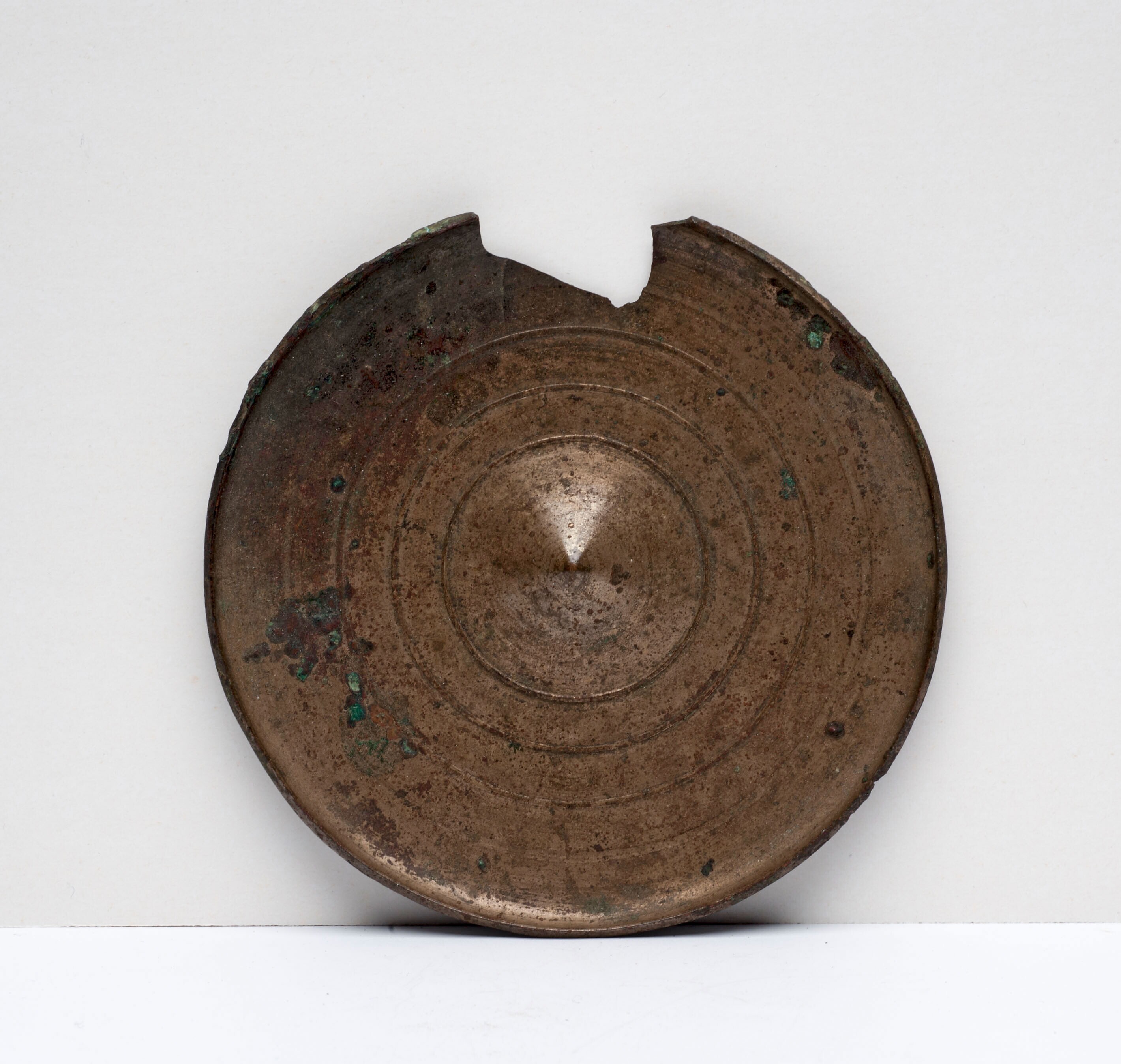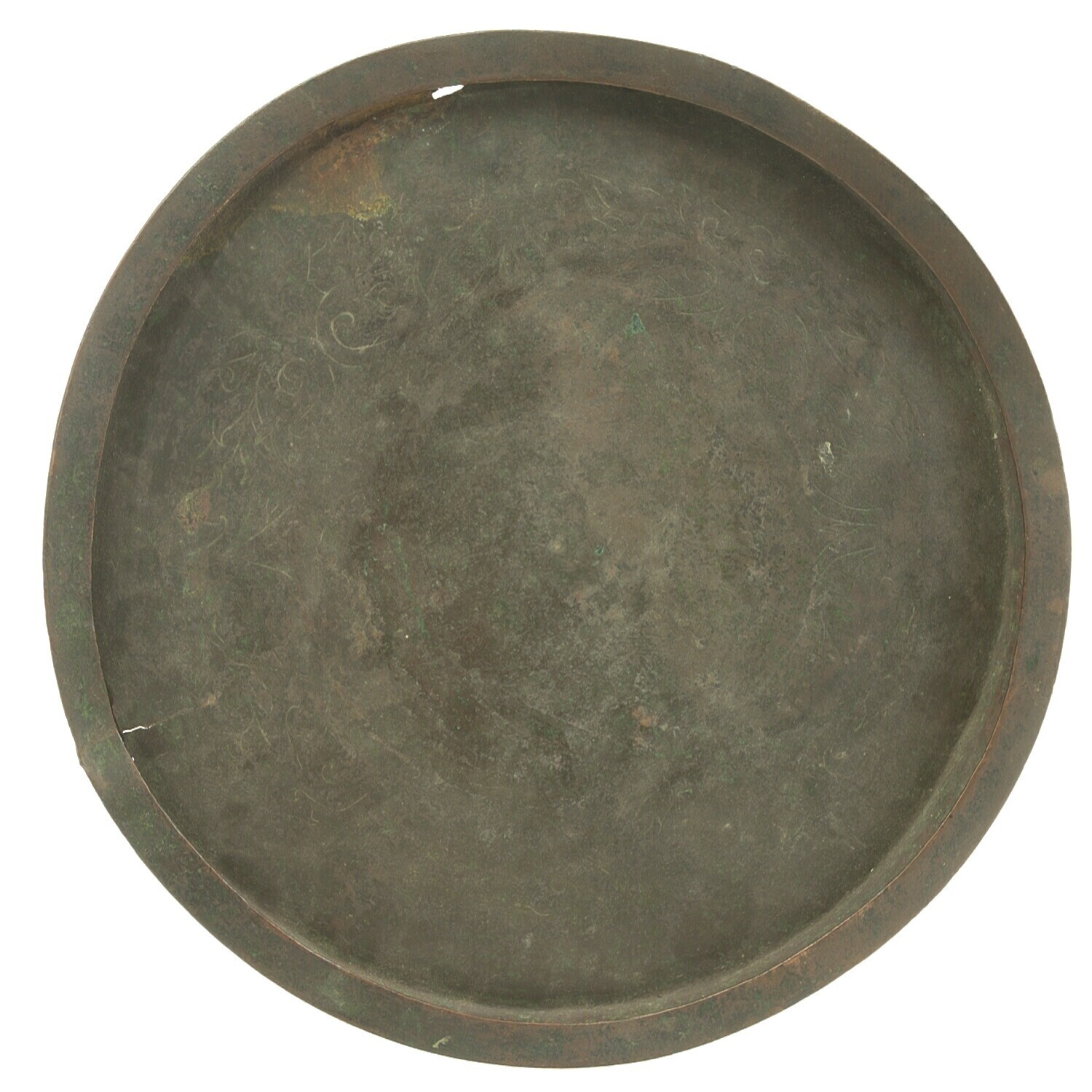 Beschadigde ronde bronzen spiegel zonder handvat