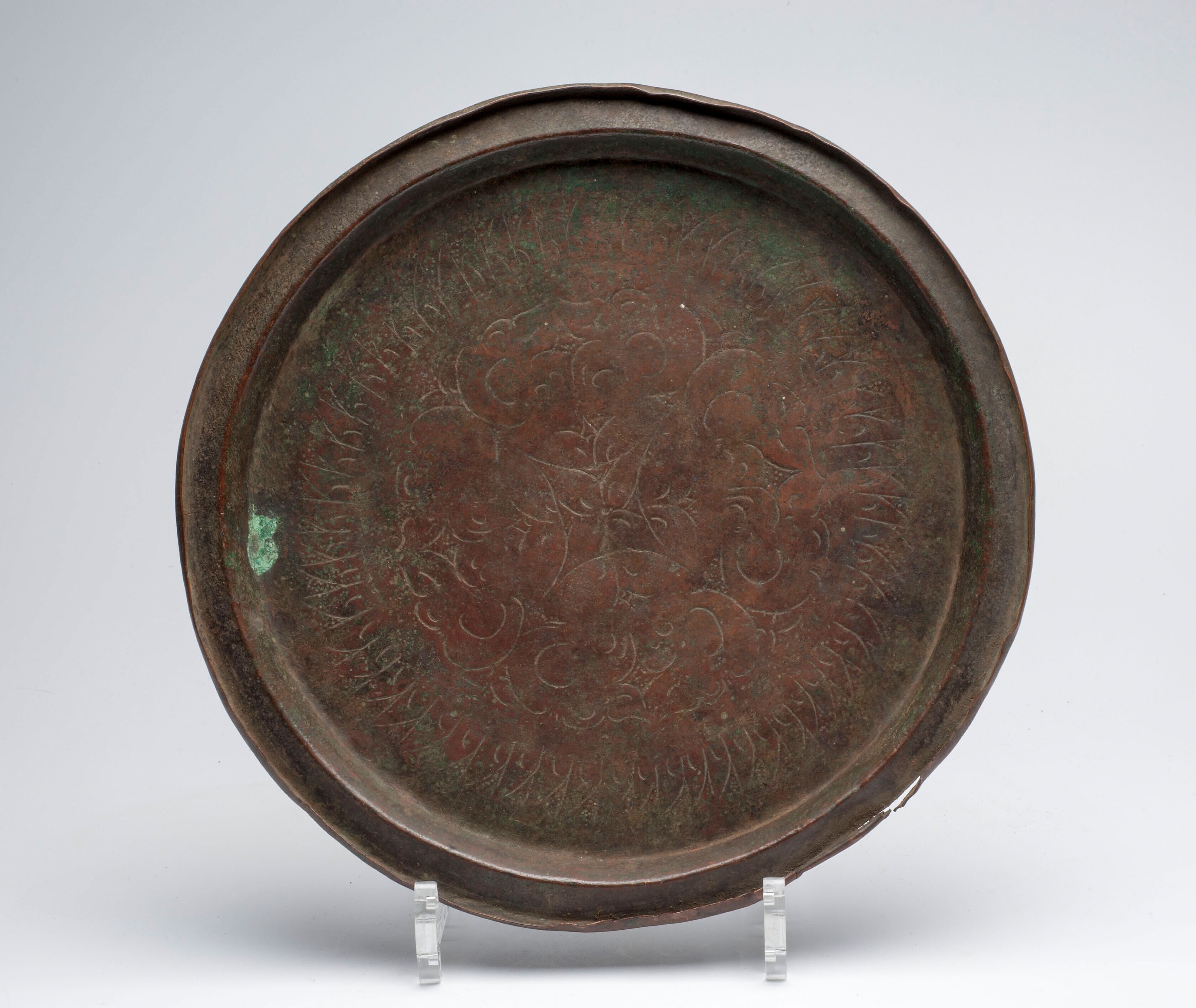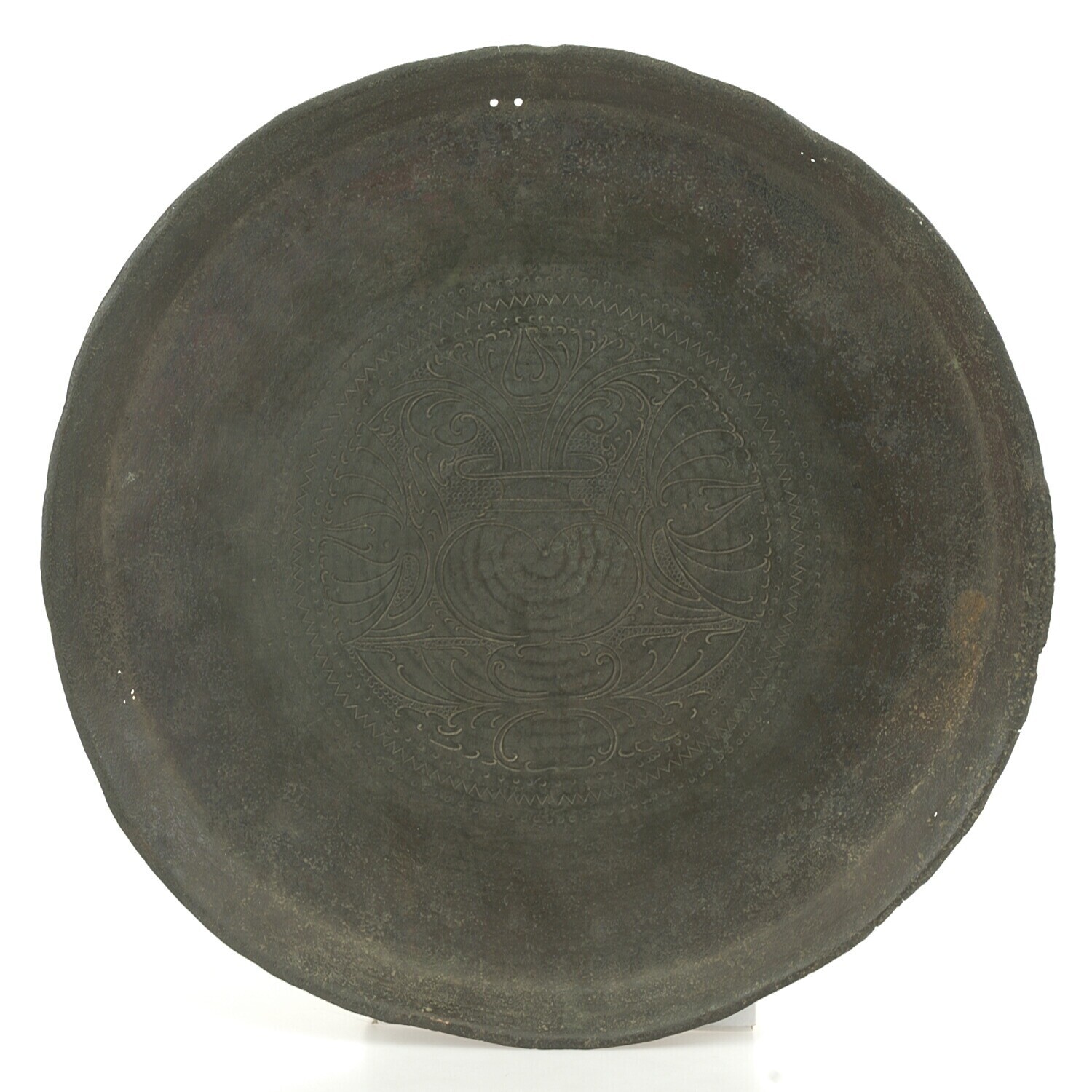 Platte koperen schaal met een lotusmotief