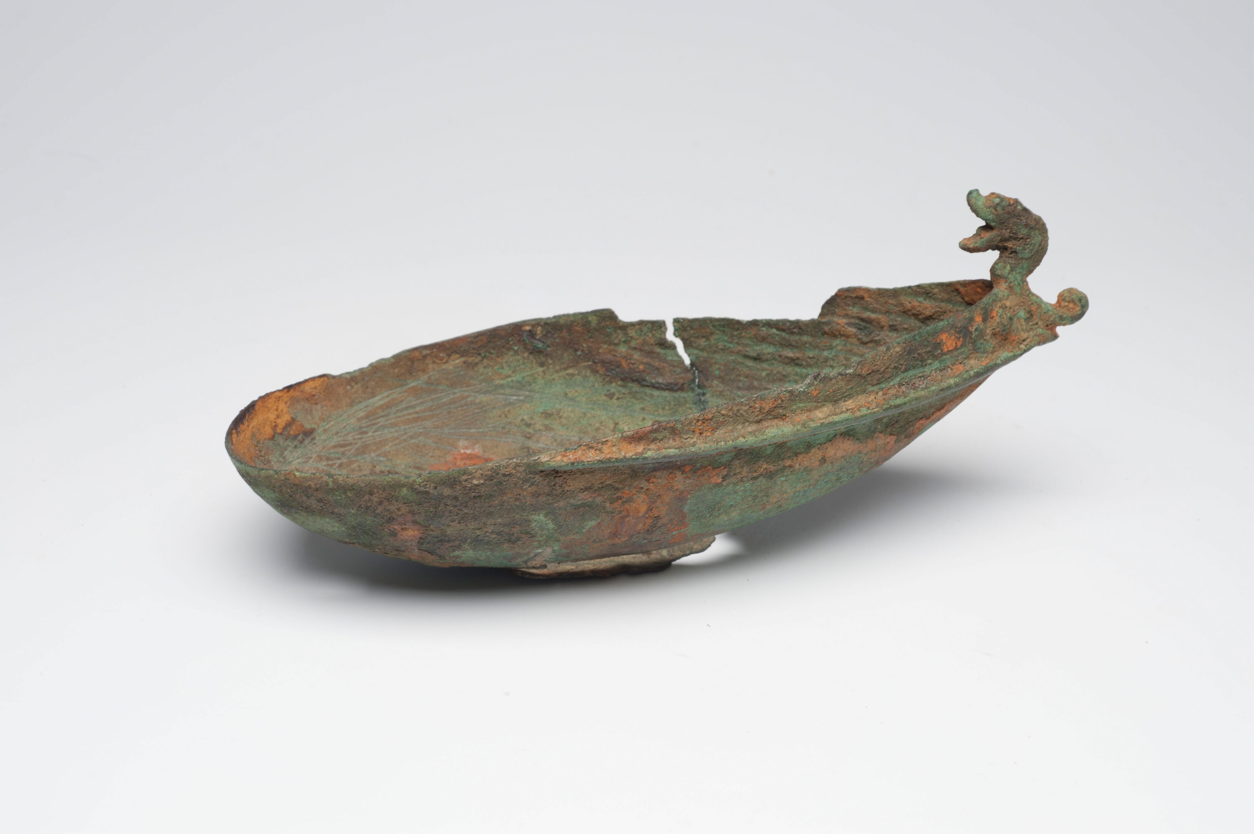Bootvormige bronzen bak met een handvat in de vorm v...