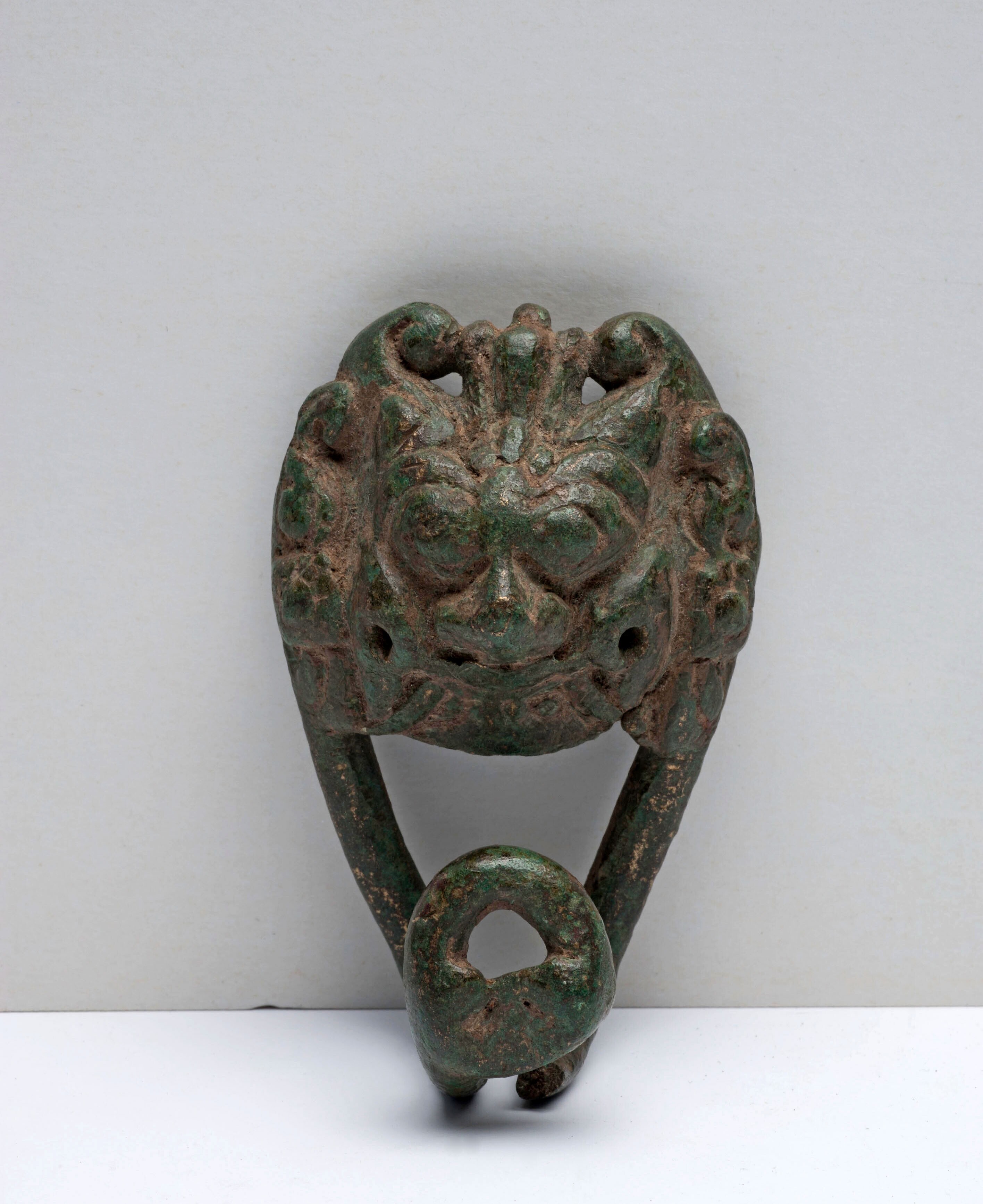 Bronzen teugelhaak in de vorm van een leeuwenkop