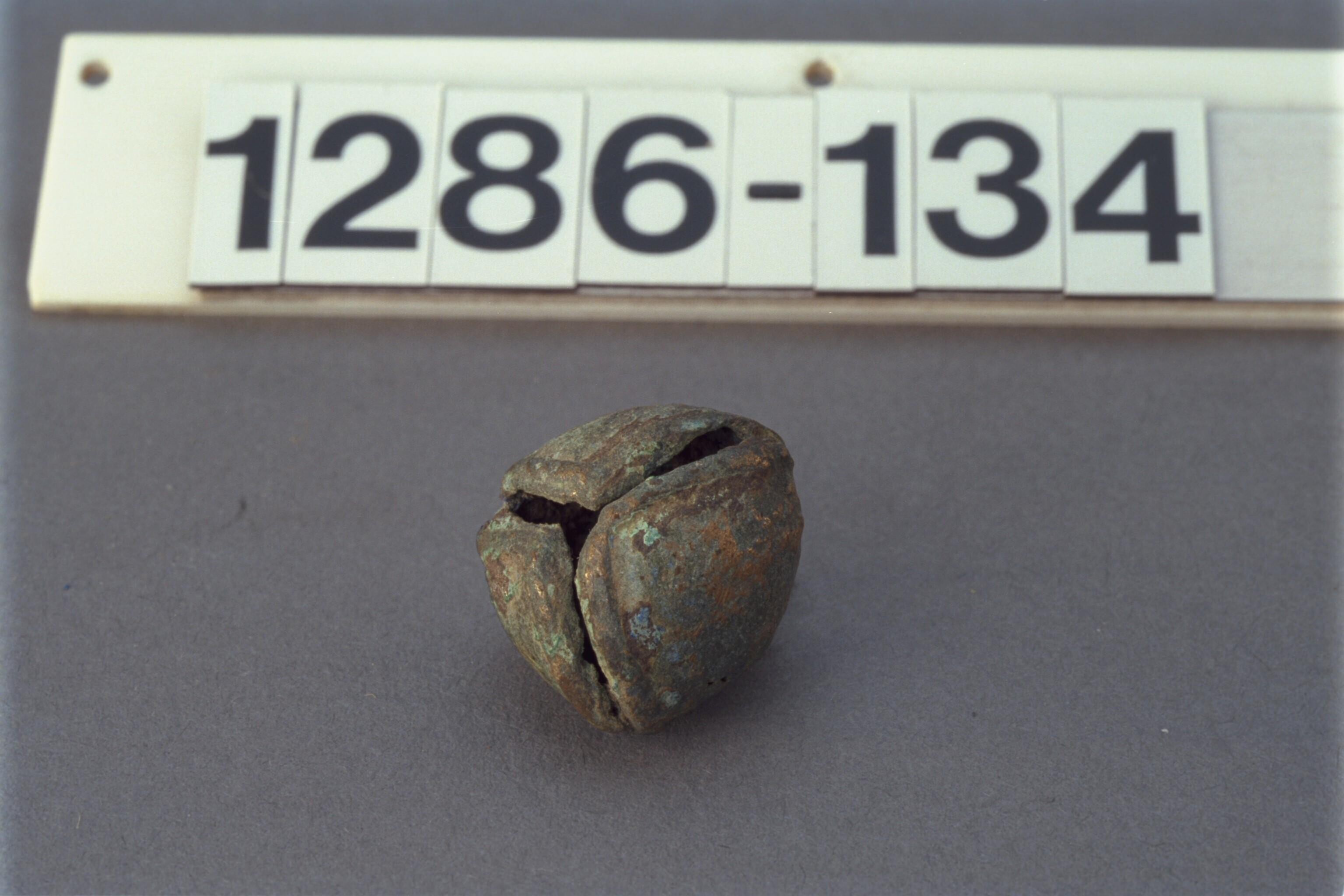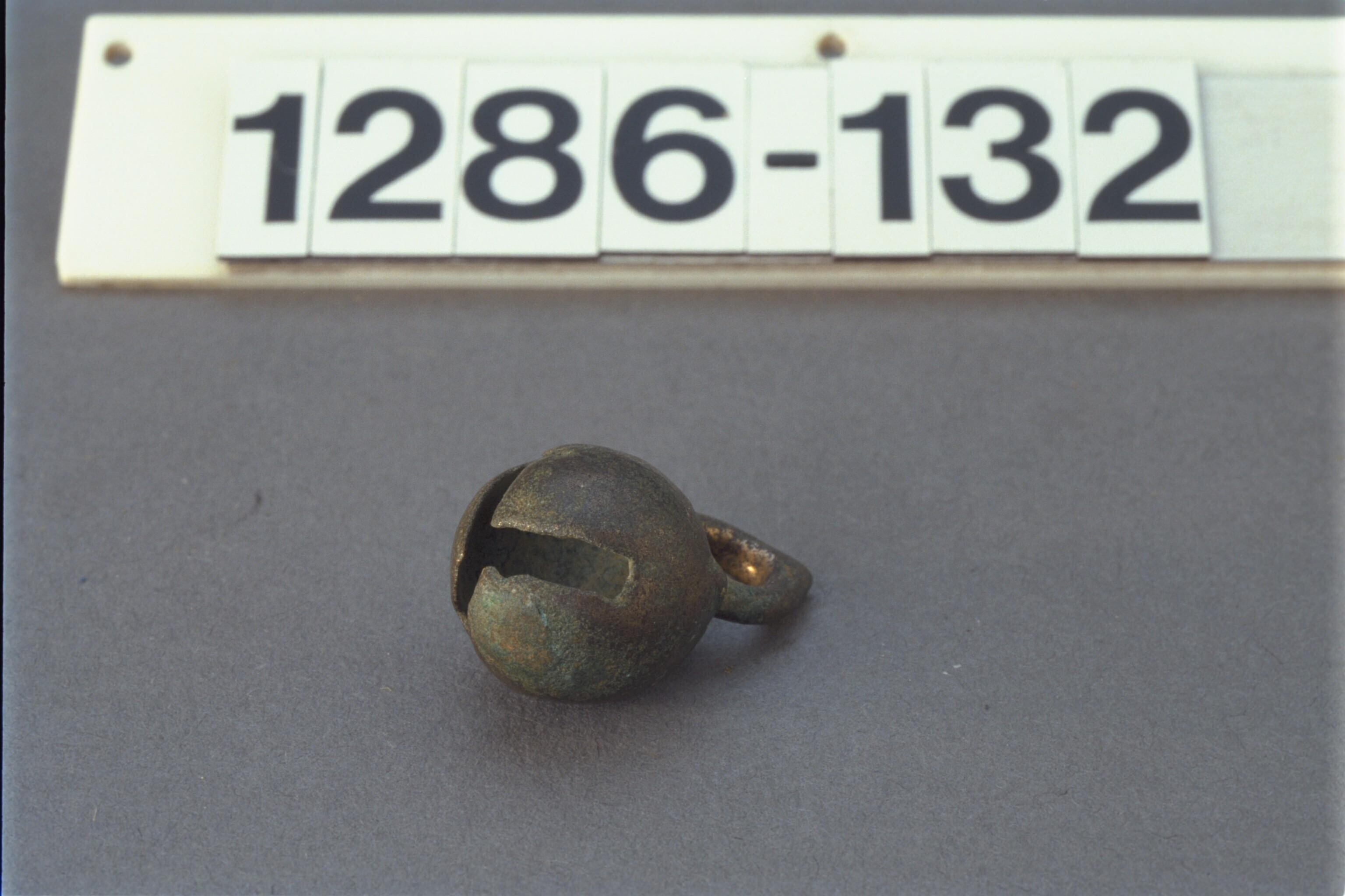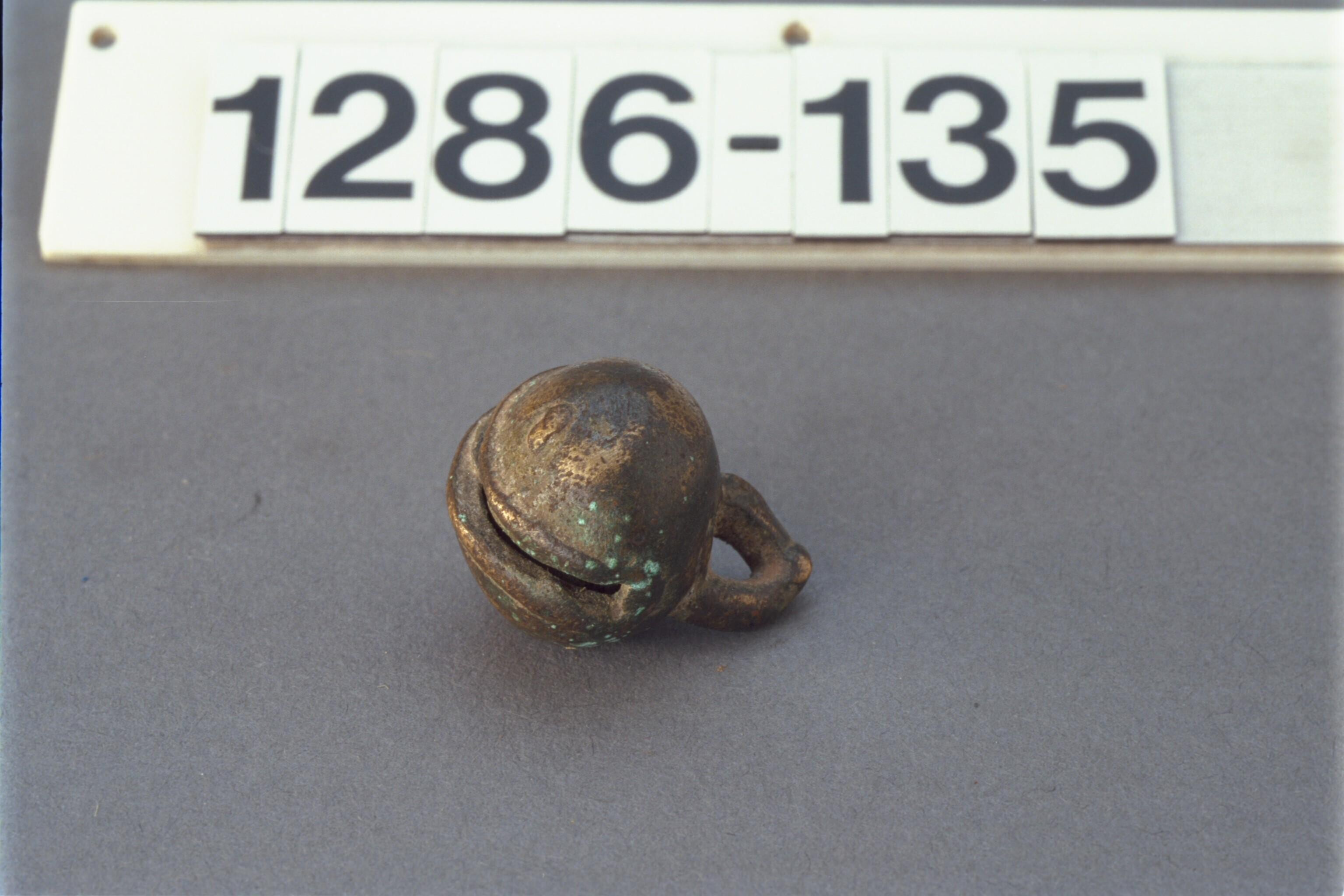 Bolvormige bronzen bel met een steen erin