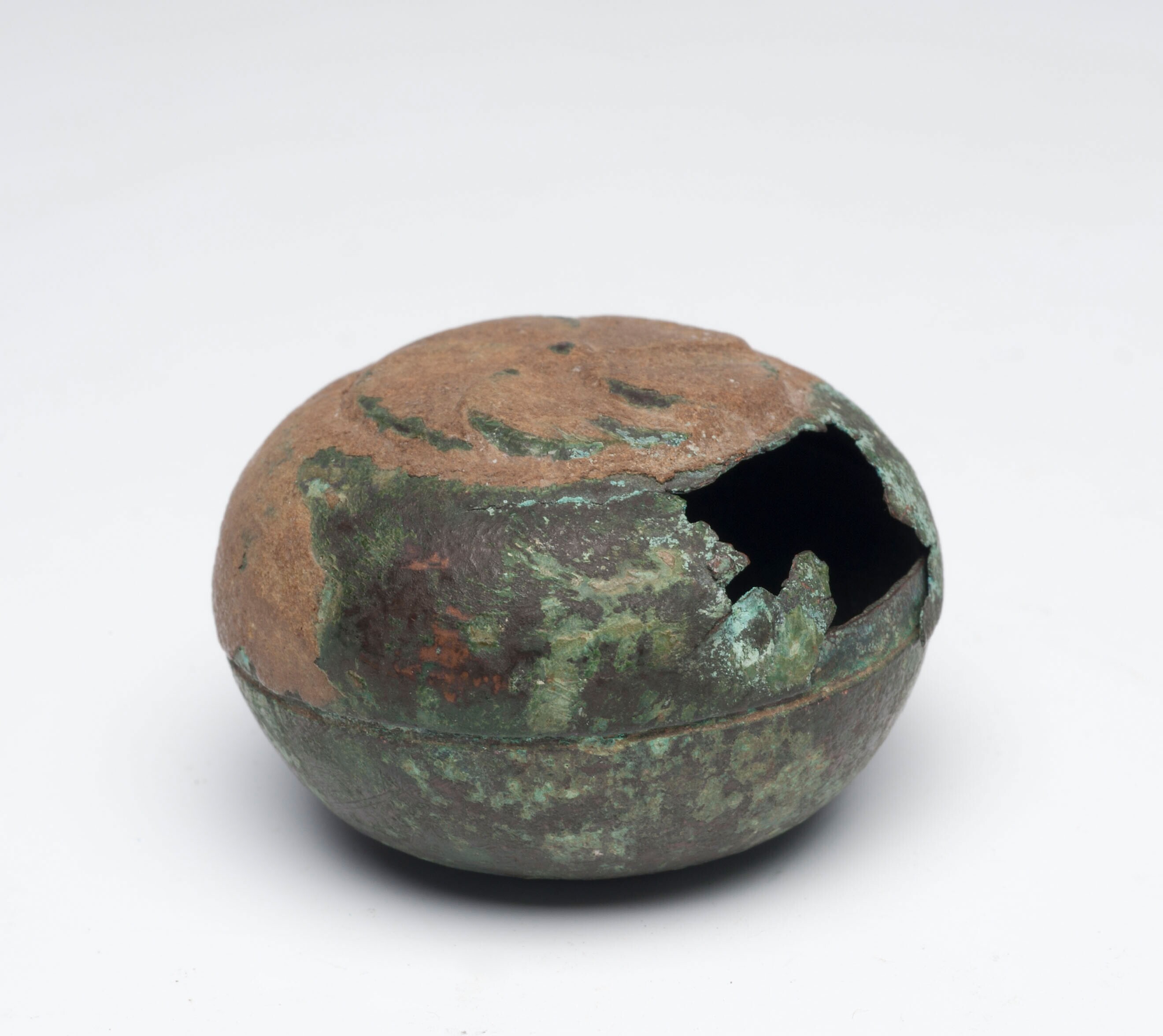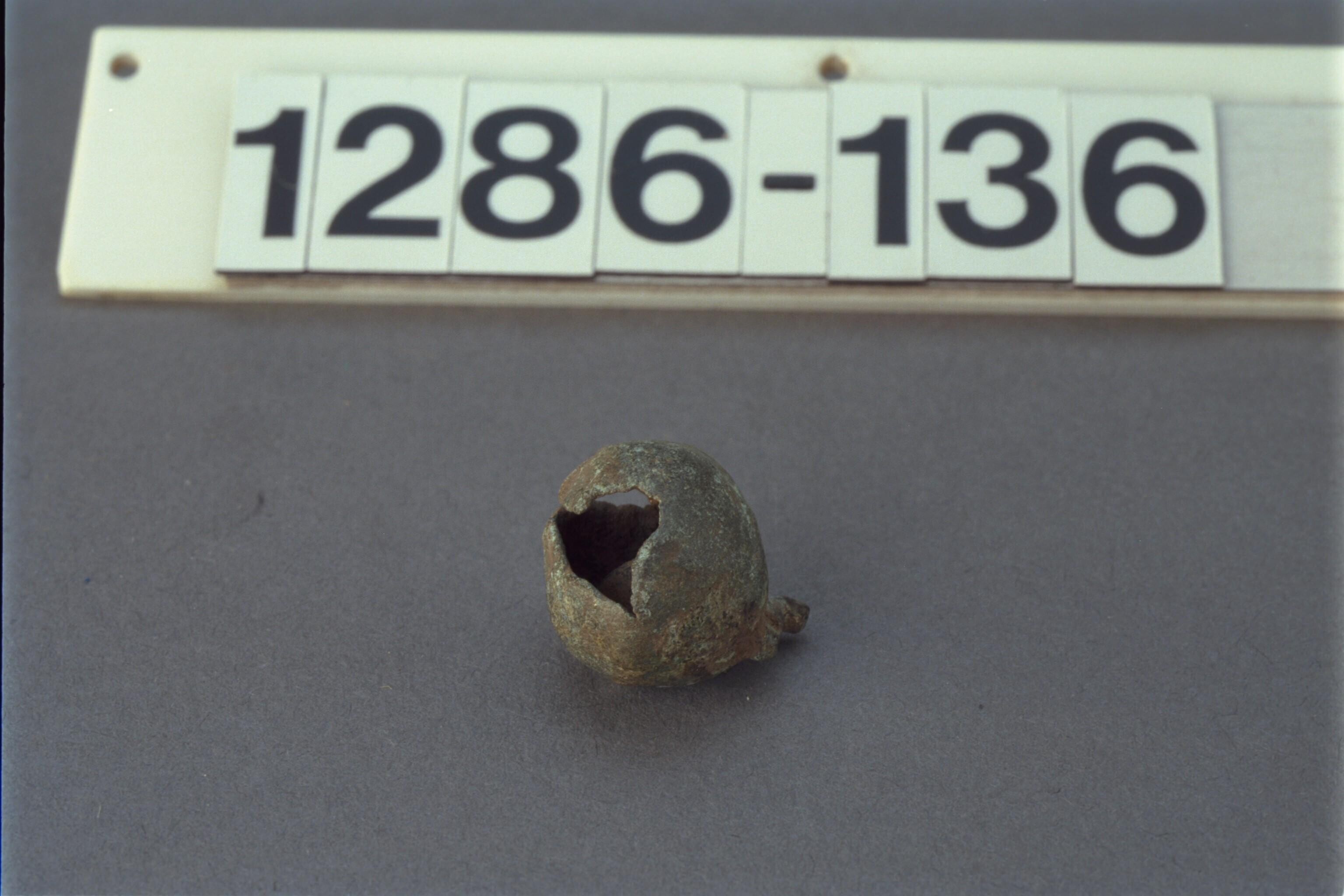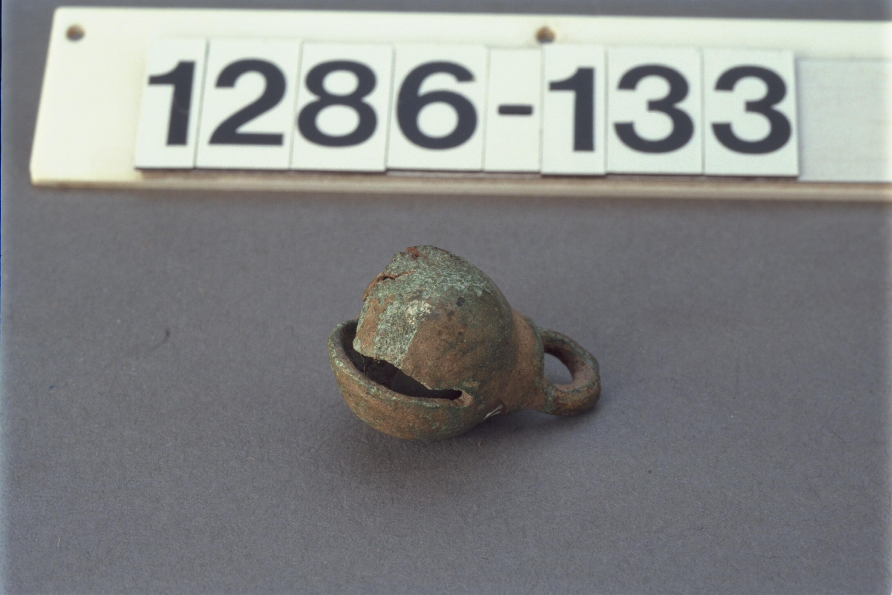 Bolvormige bronzen bel met een steen erin