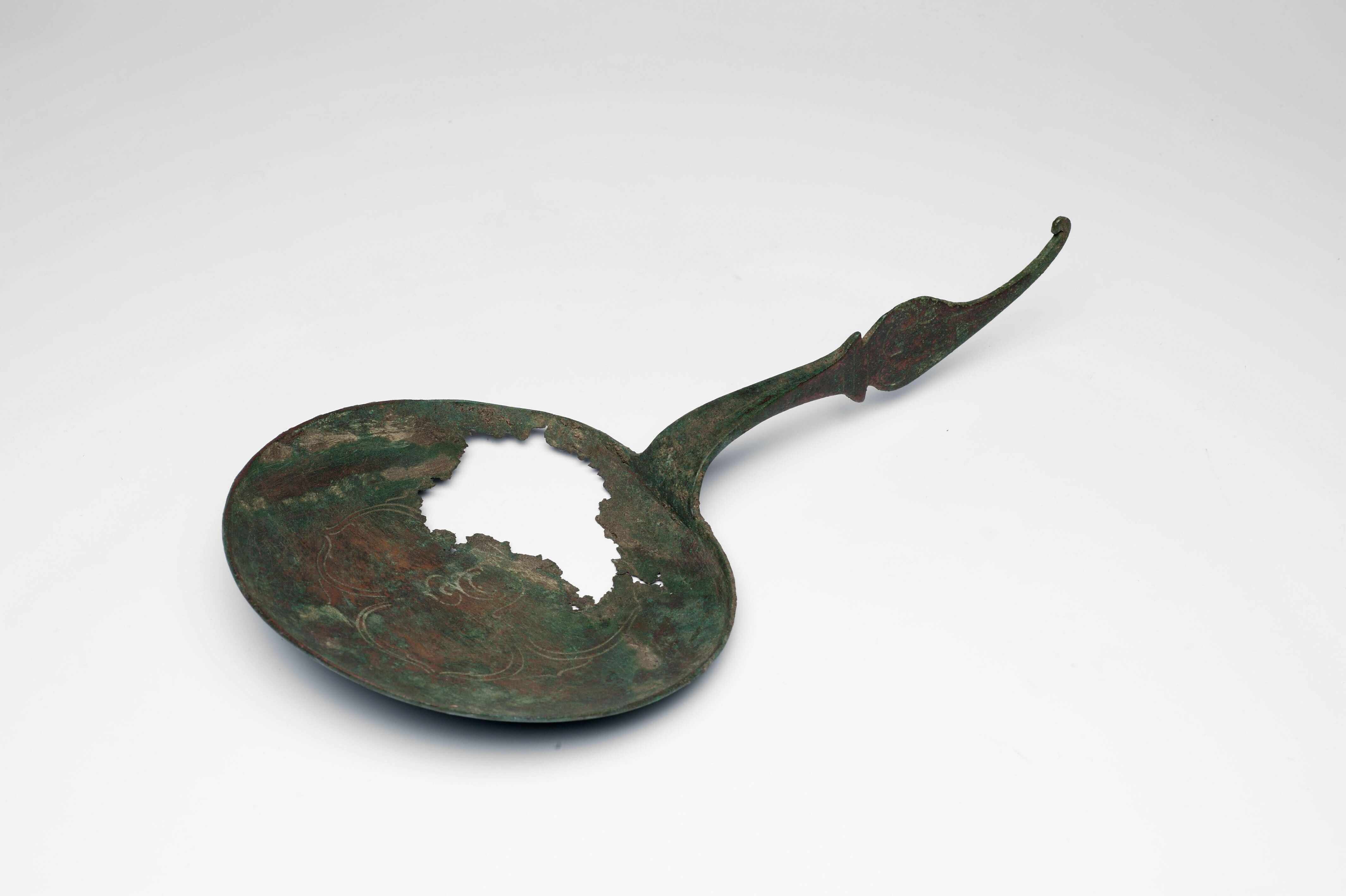 Koperen offerlepel met een ingegraveerde versiering