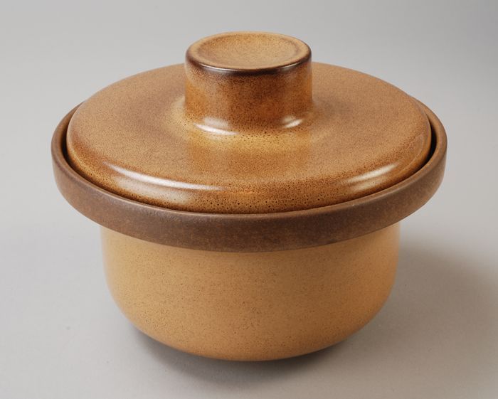Bruine dekschaal (A) met deksel (B), model Blaricum