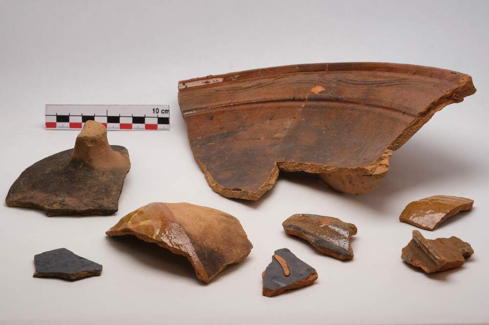 Fragmenten, baksteen/been/ijzer/aardewerk/glas,