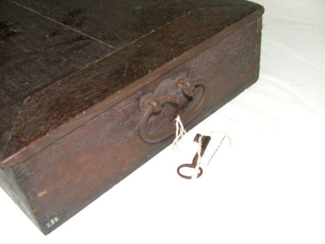 Eikenhouten geldkist met ijzeren beslag en sleutel.