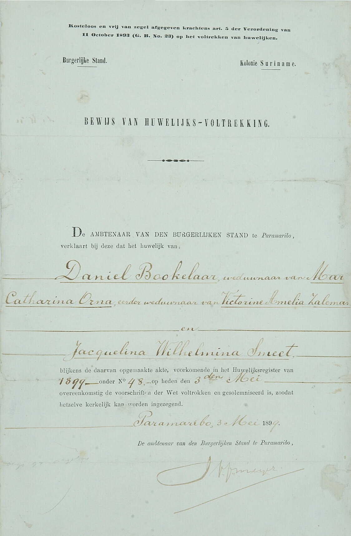 Bewijs van huwelijksvoltrekking van Daniel Bookelaar...