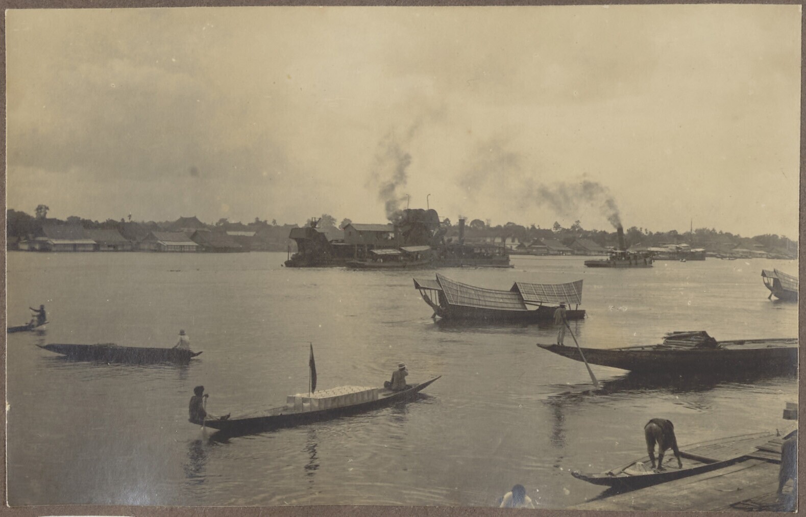 Gezicht over de rivier Musi met handelsvaartuigen en...