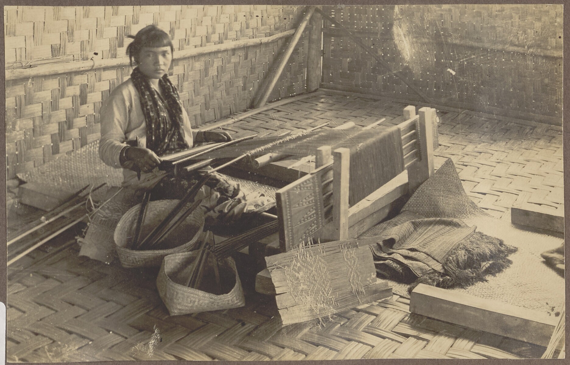 Een weefster achter een weeftoestel, Moeara Tiga