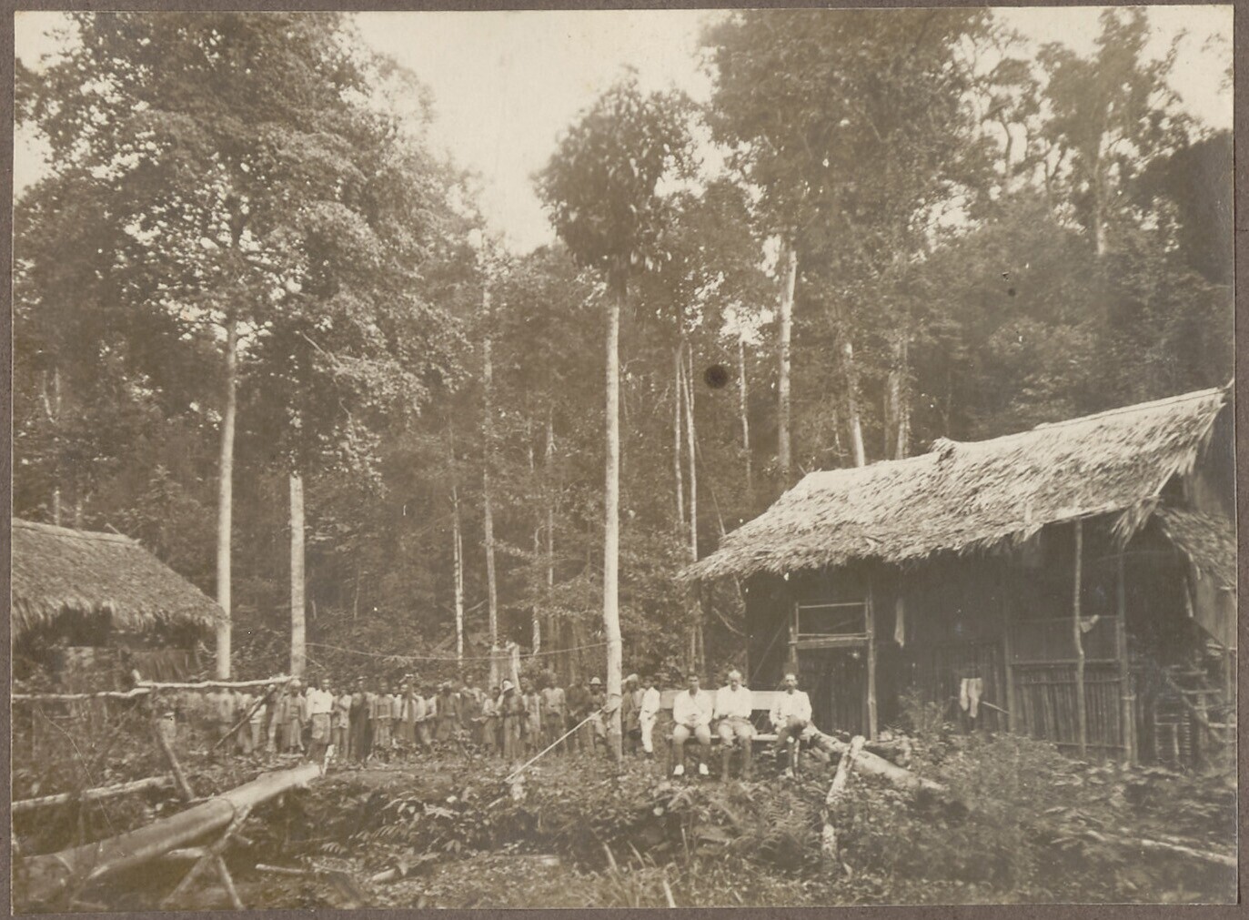 Houtvesters poseren met mevrouw Klinkert bij een wagon
