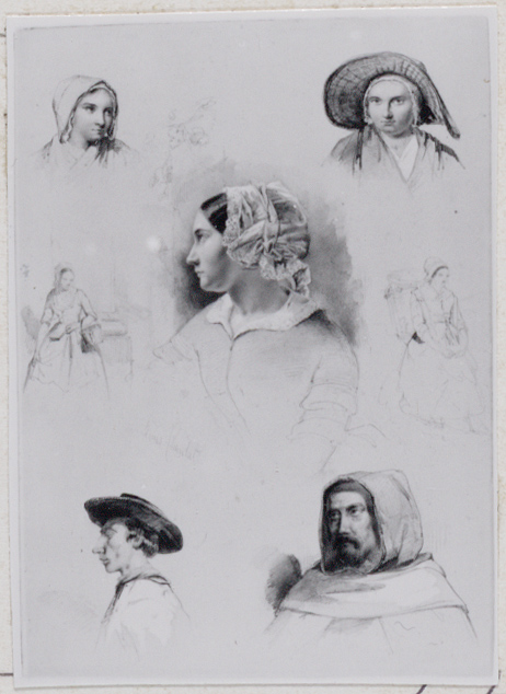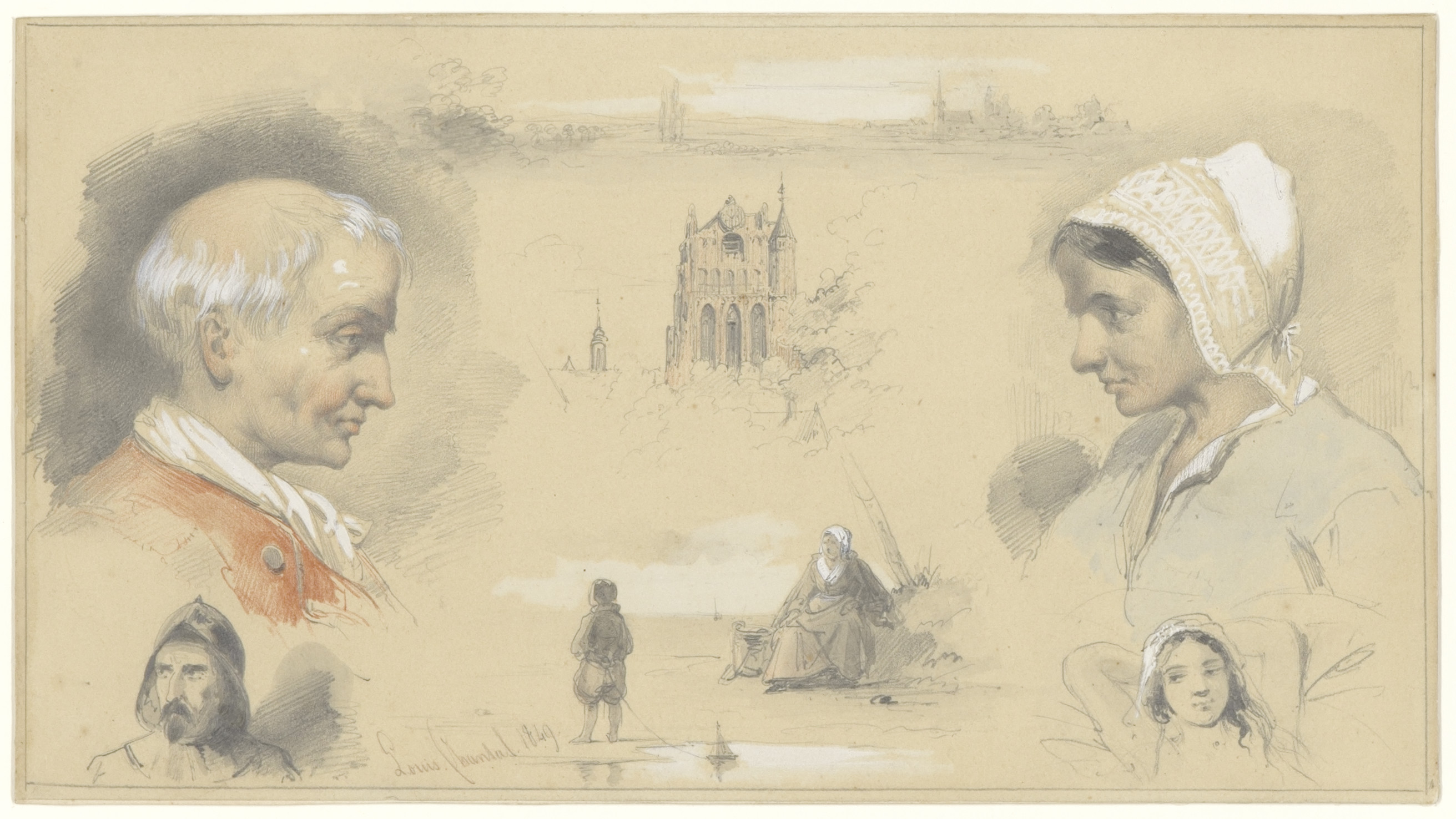 Studieblad met hoofden ter weerszijden van kerk