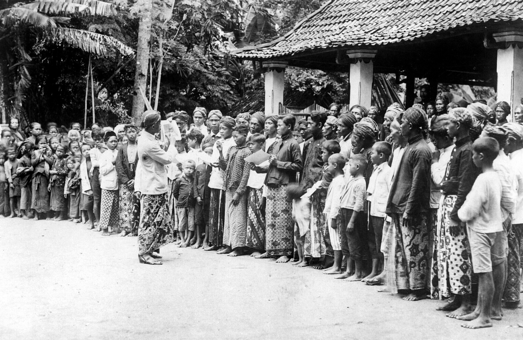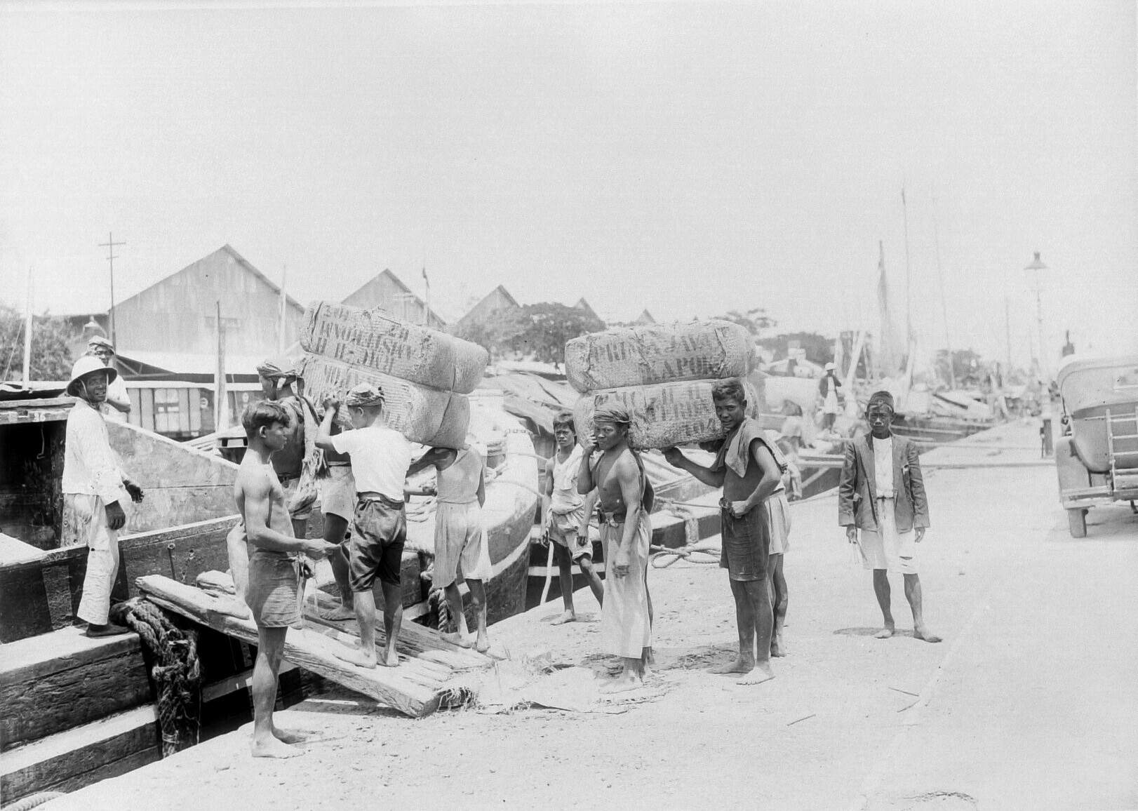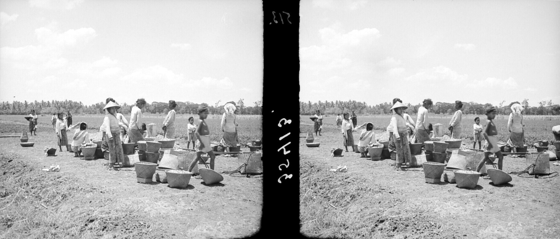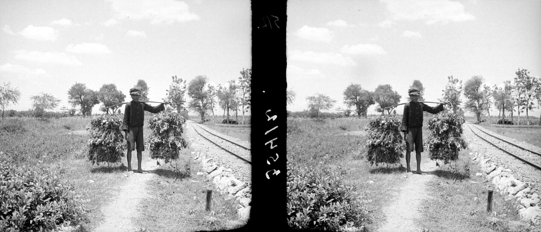 Een man met geoogste aardnoten (arachis) te Cheribon