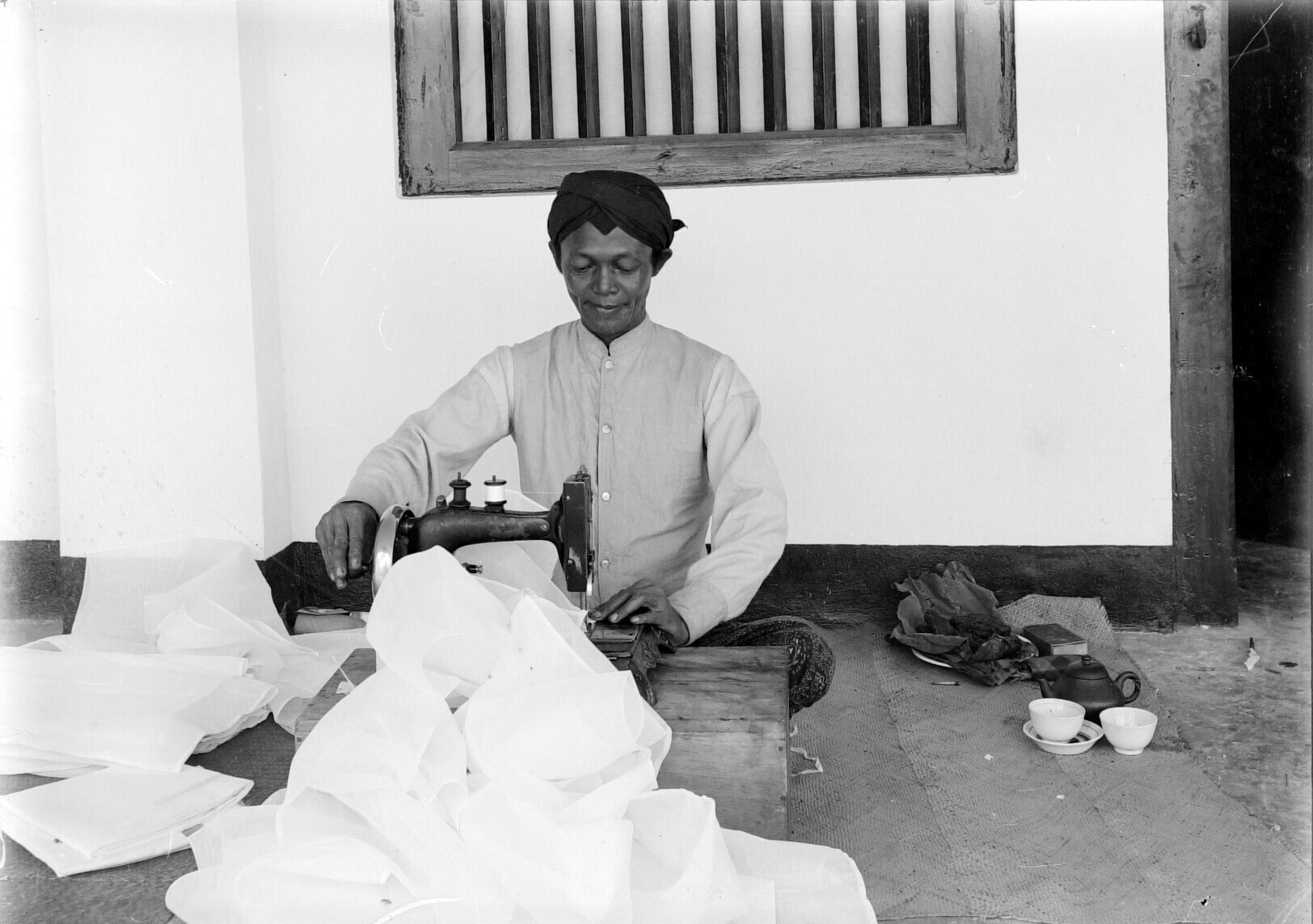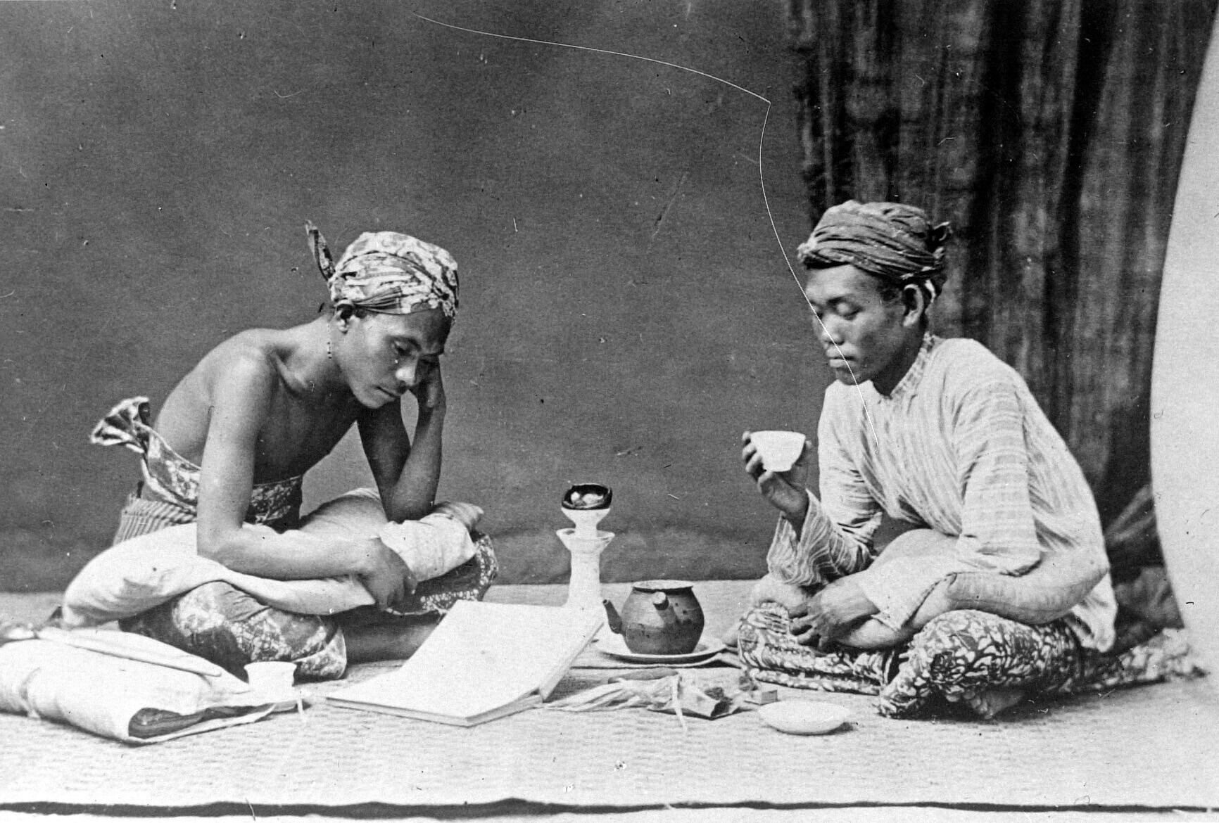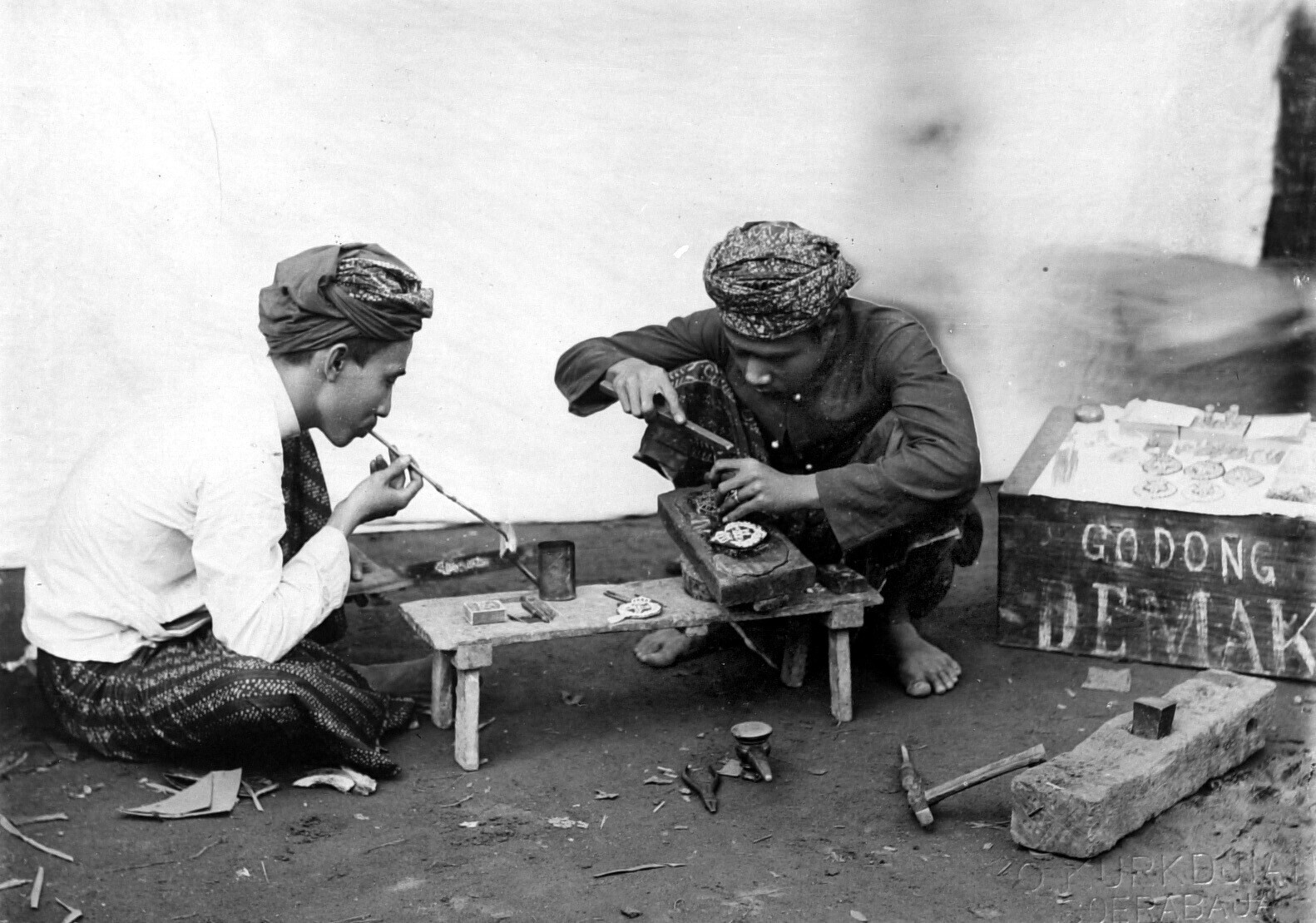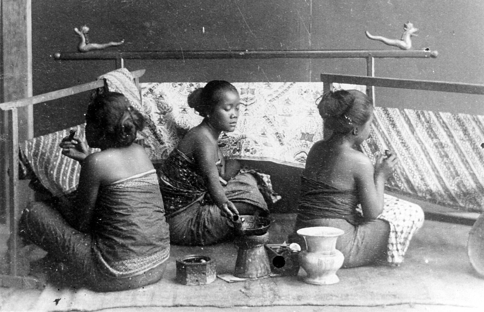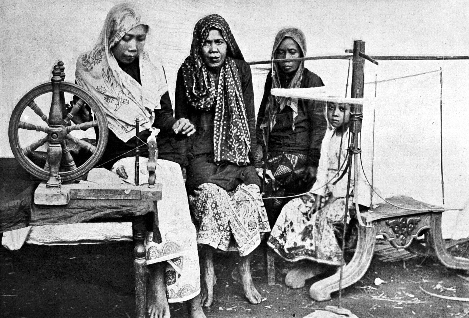 Javaanse zijde-weefsters met spinnewiel en de gareno...