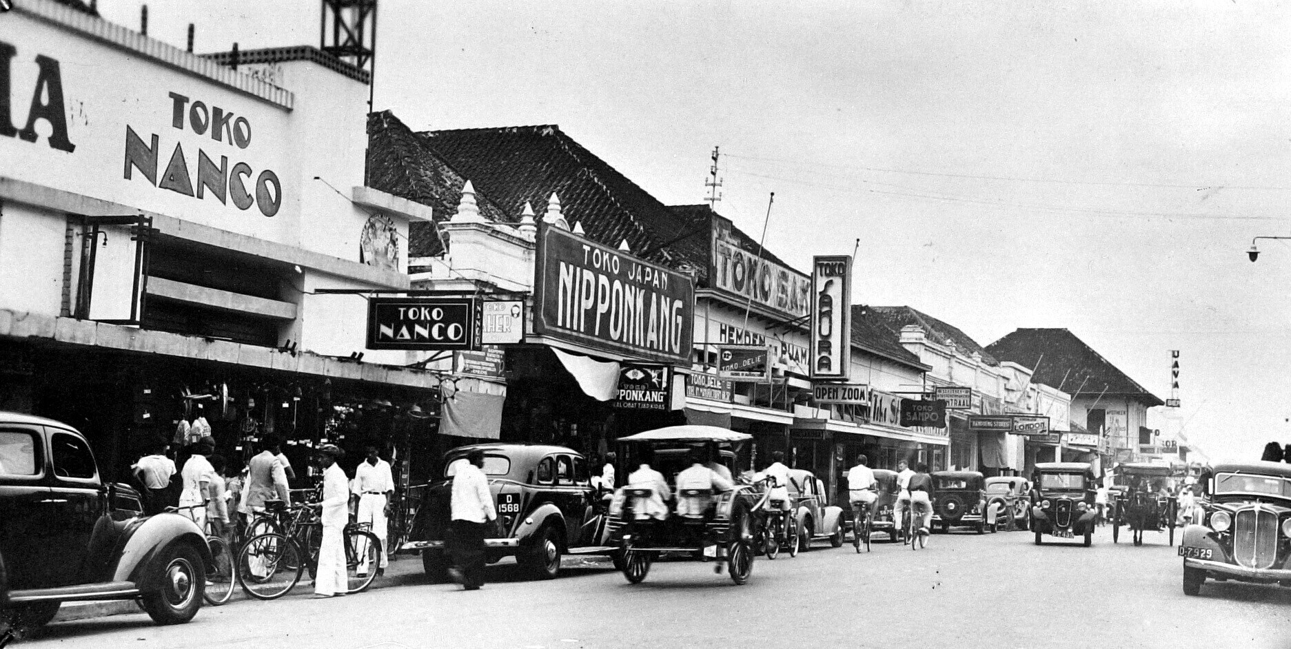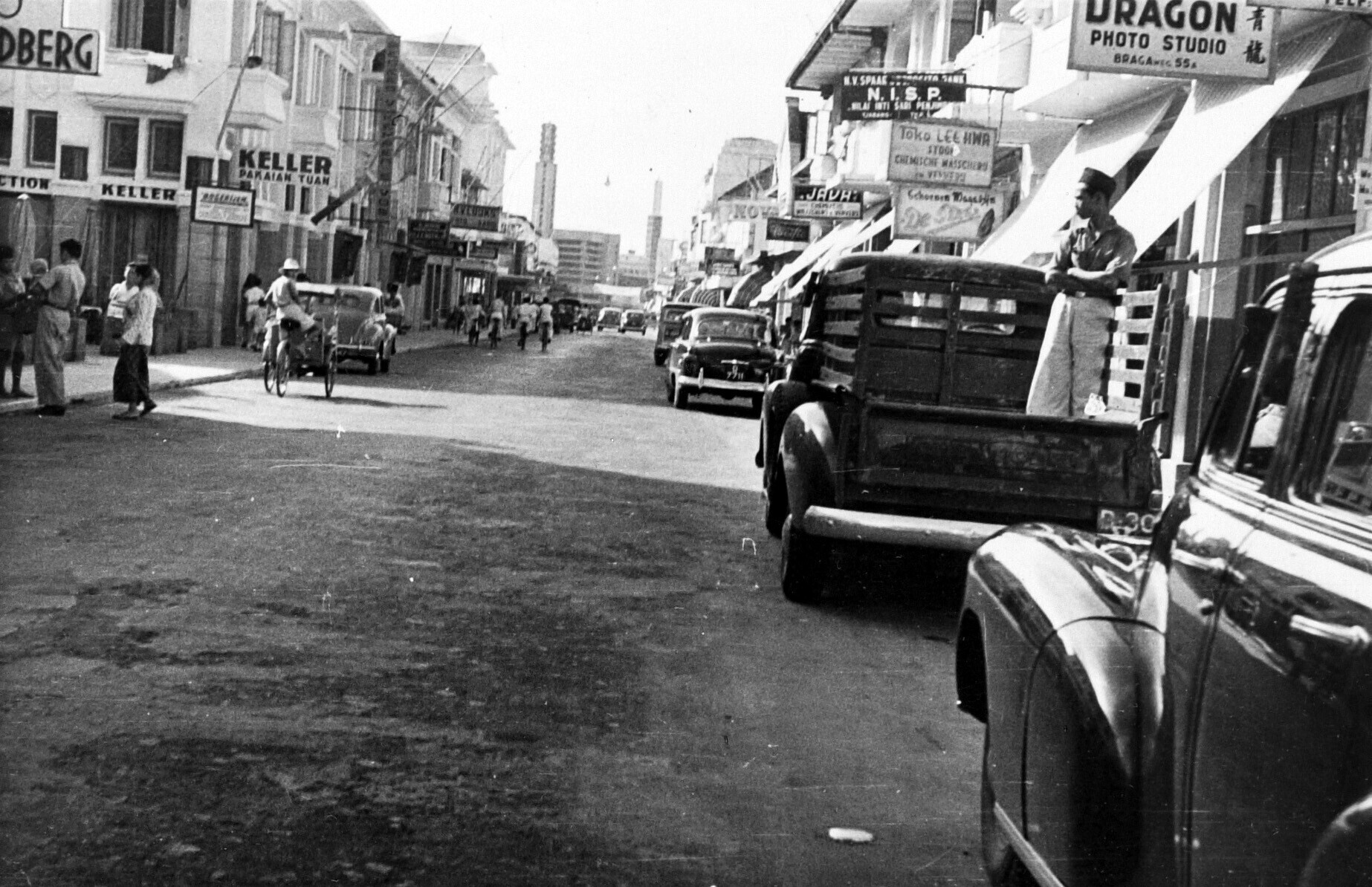 Winkels en auto's op de Groote Postweg, Bandoeng