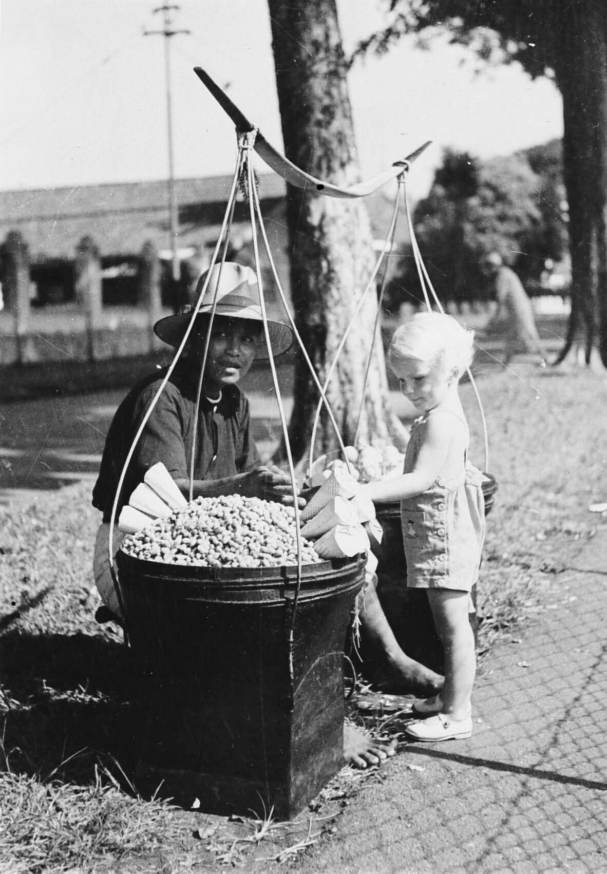 Een katjangverkoper en een Europees kindje te Jakart...