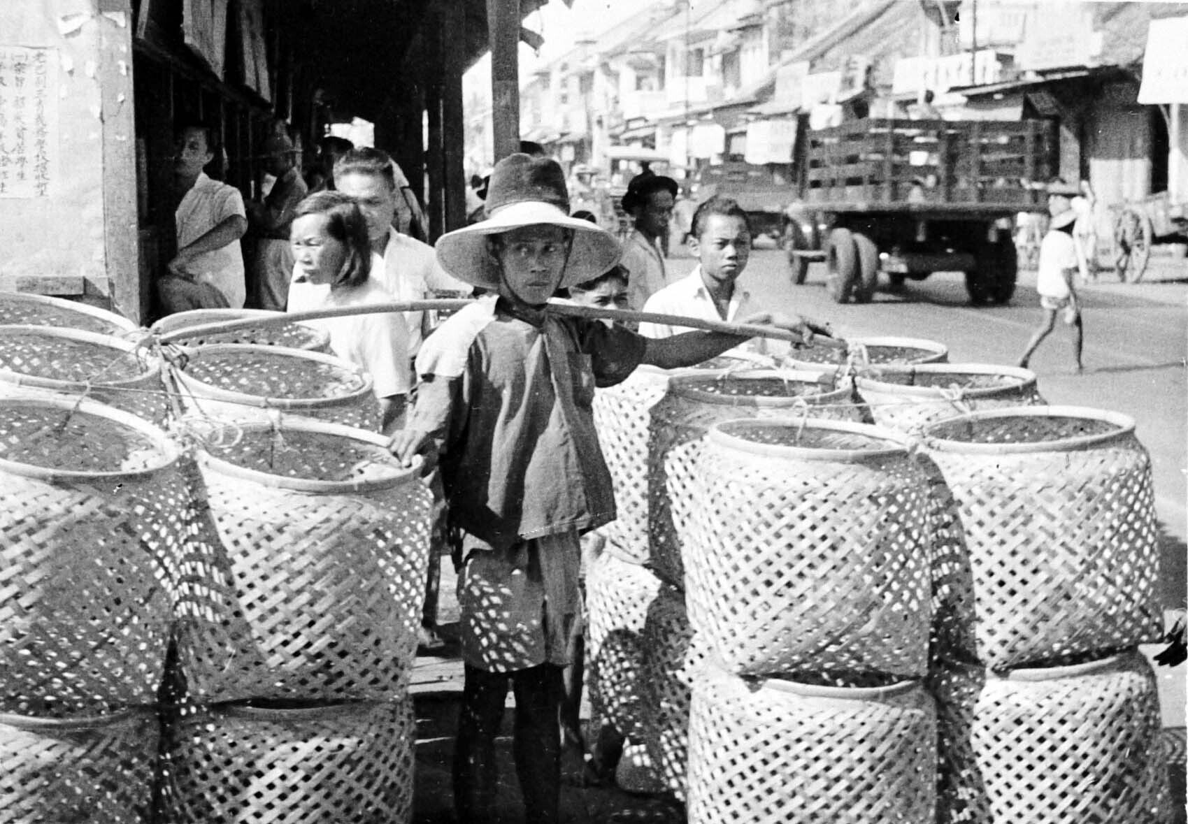Een mandenverkoper op de markt 'Pasar Senen' te Jaka...