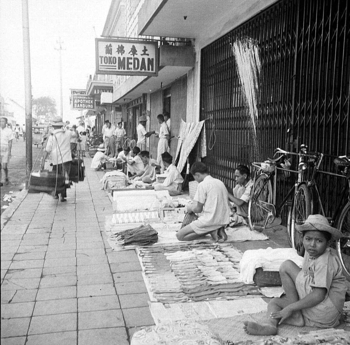 Winkeltjes met textiel e.d. te Madiun, Oost-Java