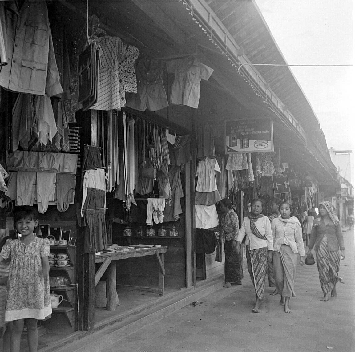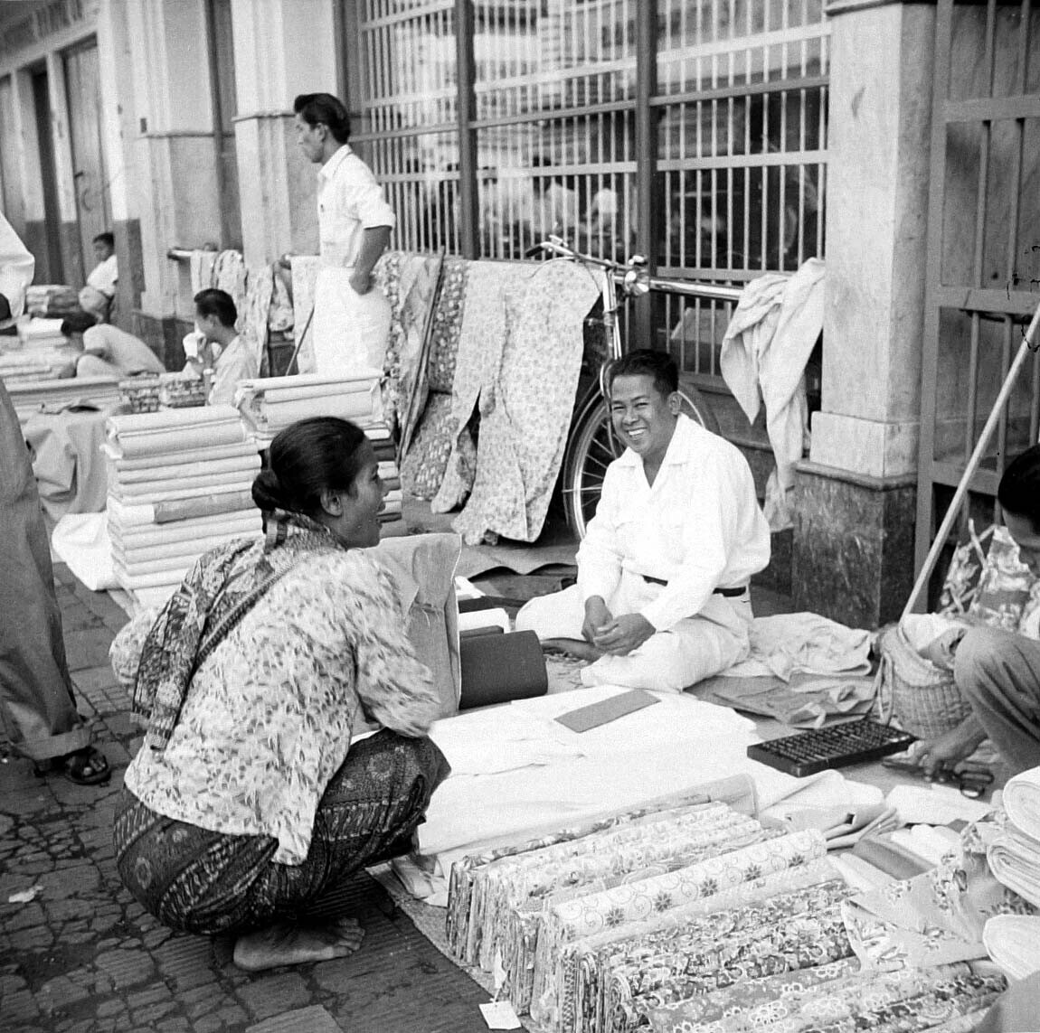 Winkeltjes met textiel te Madiun, Oost-Java