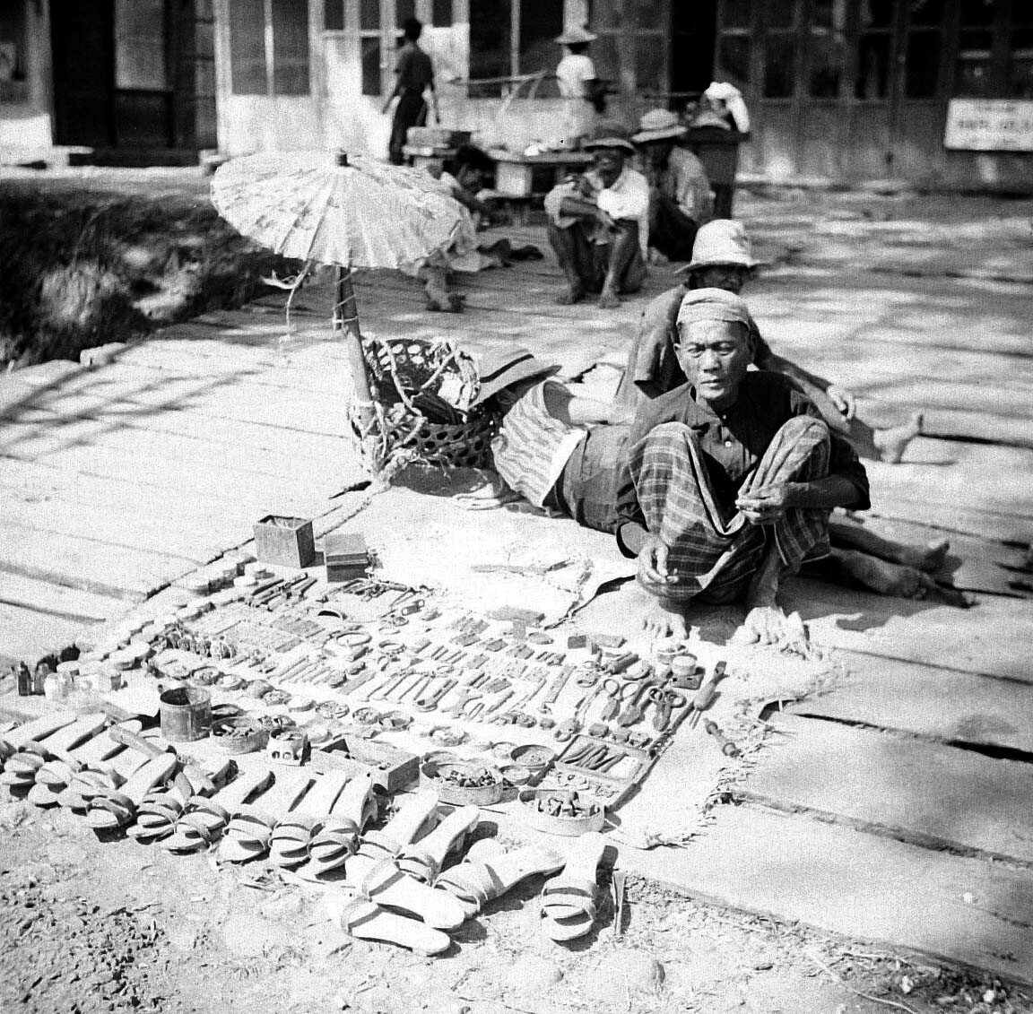 Verkoop van pajongs (parasols) langs een van de hoof...