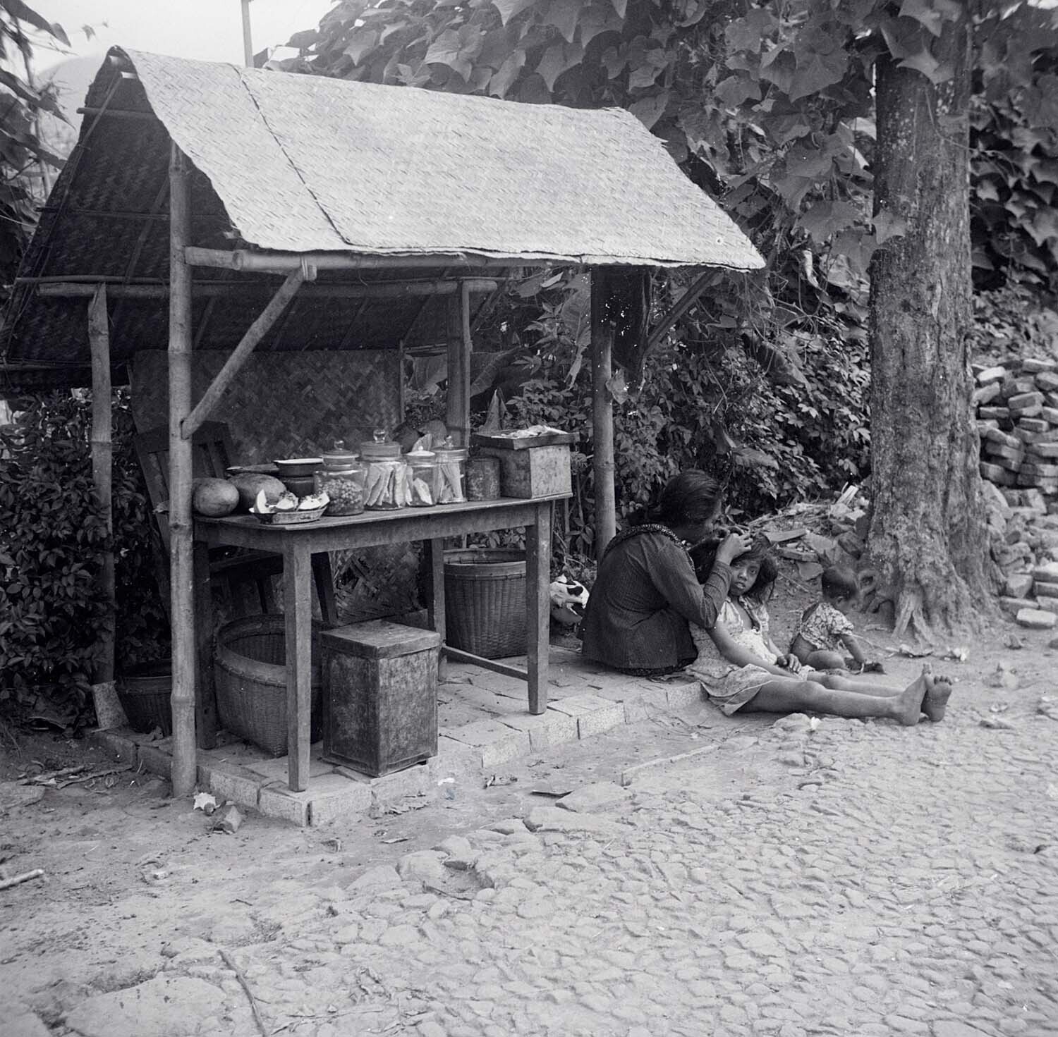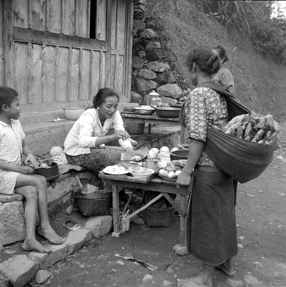 Marktkraam (warung) langs de oude weg Plaosan te Sar...