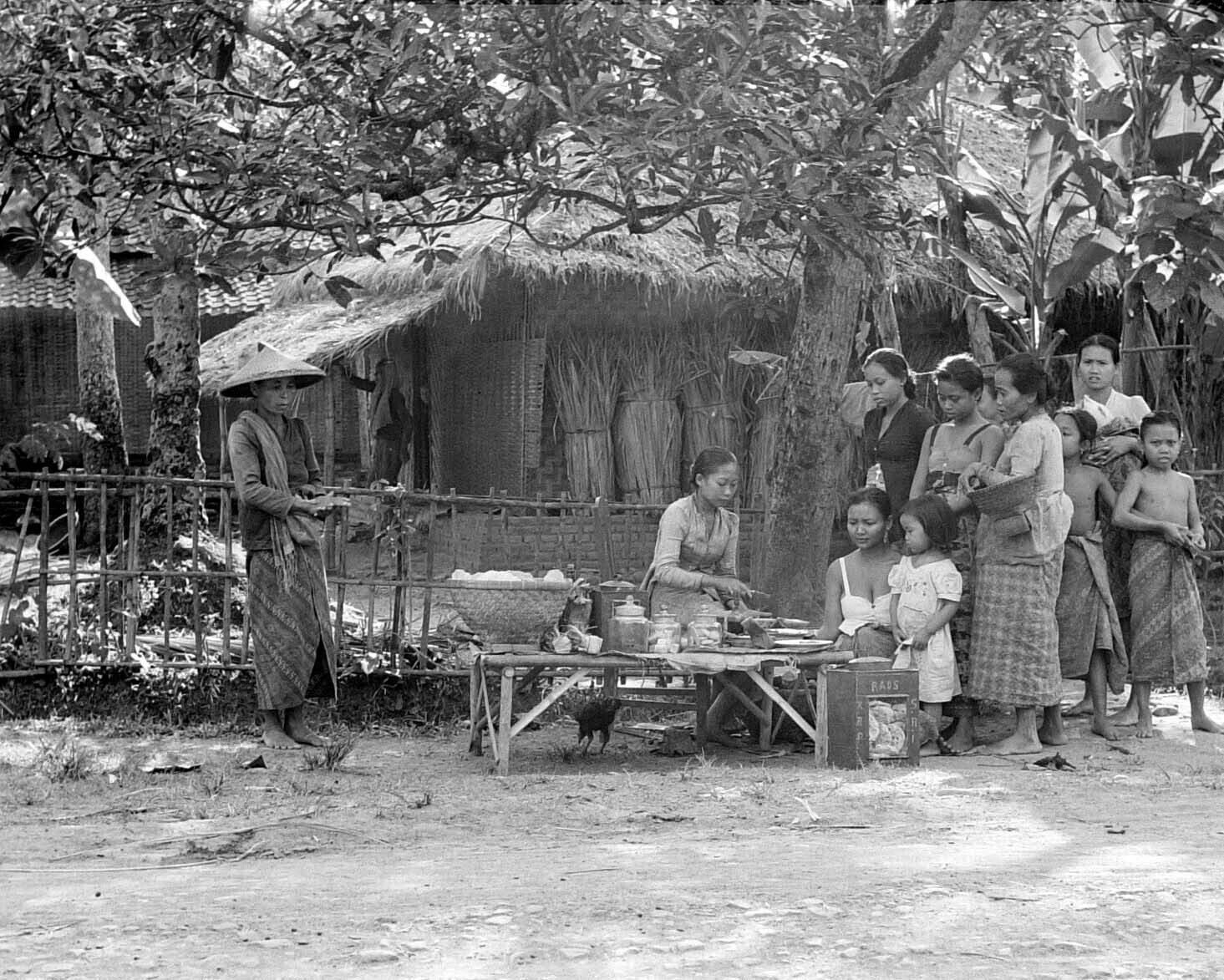 Een groep vrouwen en kinderen staat bij een kraampje...