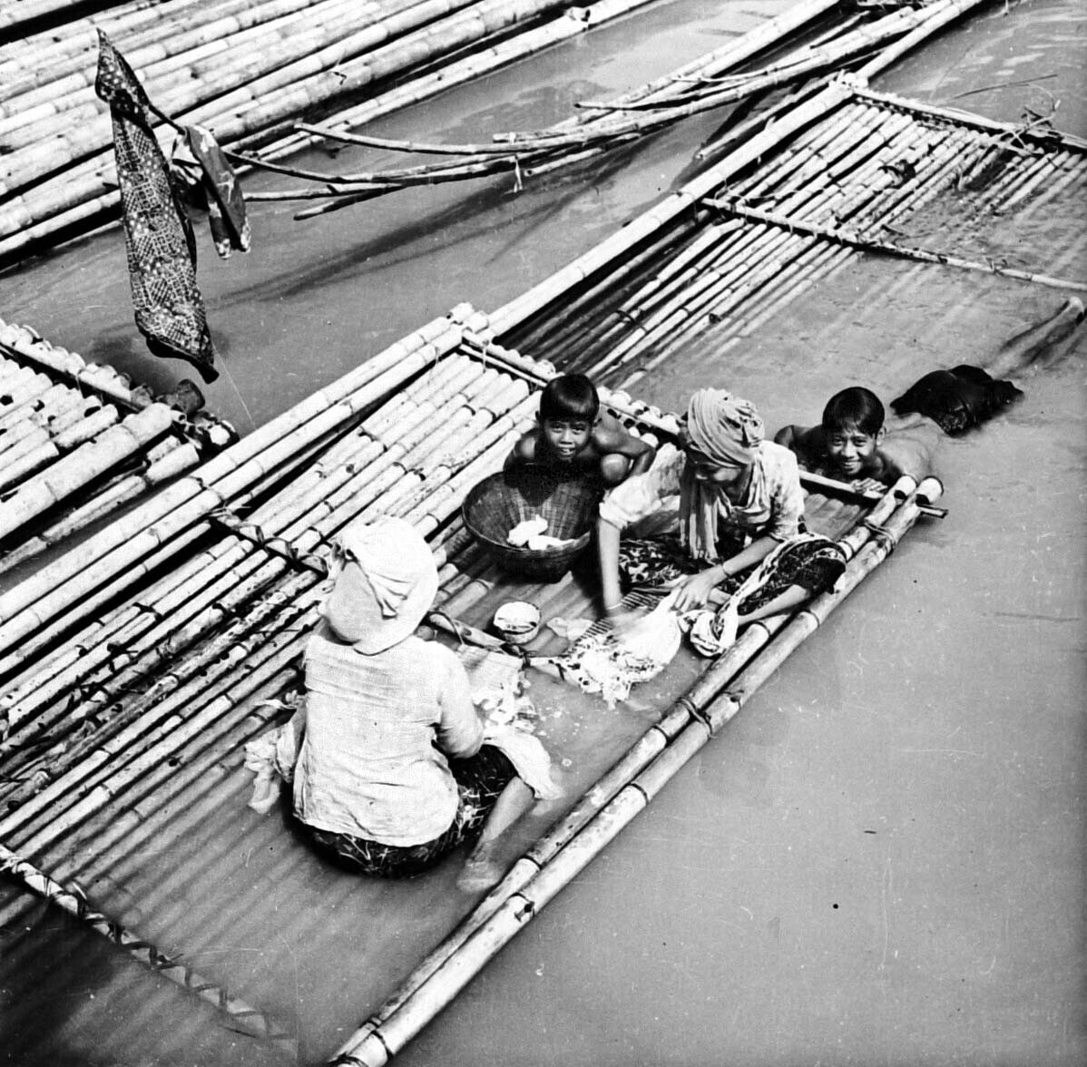 Wassen van kleding en lichaam in de rivier in Batavi...